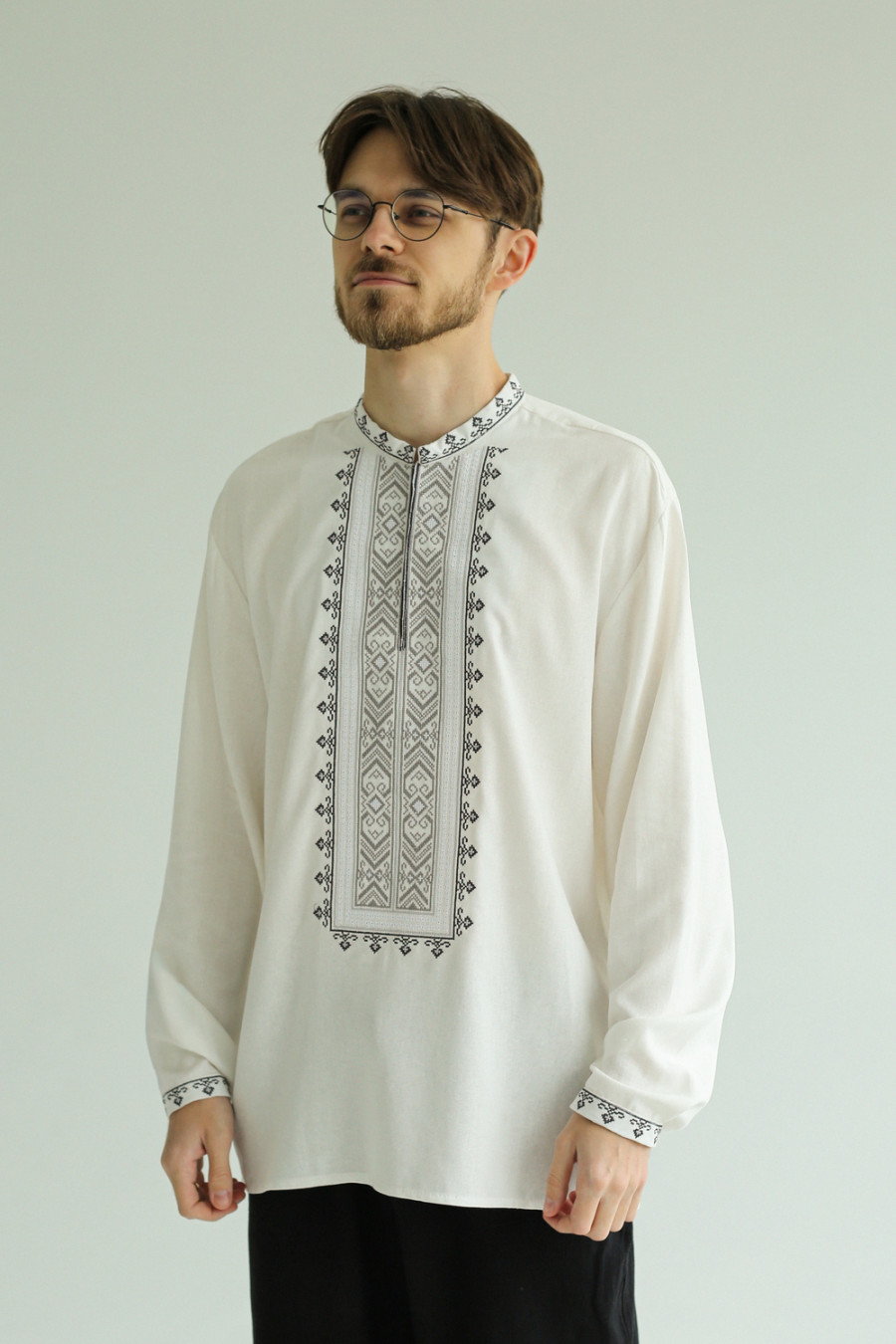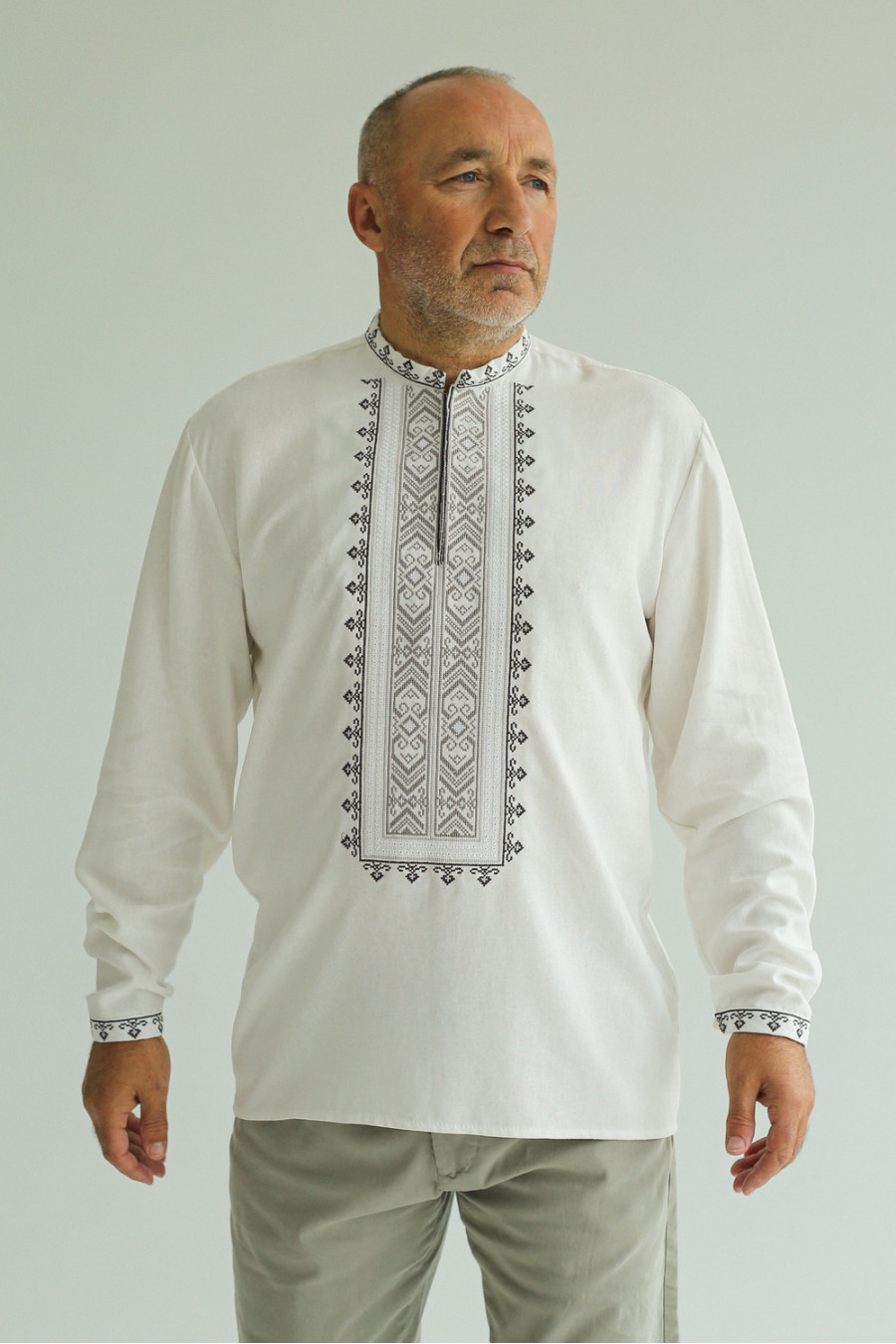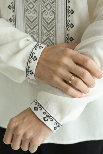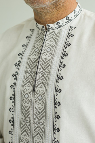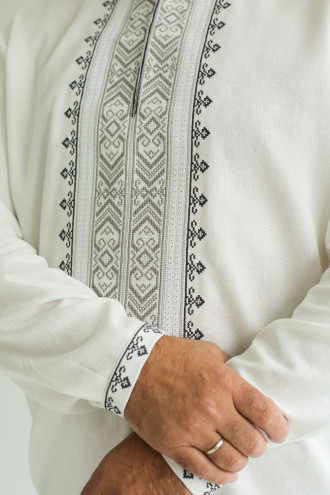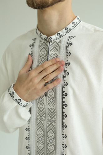 Чоловіча вишиванка в сучасному стилі зі змішаної лляної тканини білого кольору з вишитим орнаментом-декором, котра буде доречною за будь-яких обставин. Модель вільного крою з комірцем-стійкою, вирізом із потаємною застібкою на поличці, приспущеною лінією плеча, відрізною кокеткою на спинці, довгими просторими рукавами з манжетами на застібці. Манишку, комір та манжети прикрашає геометричний орнамент хрестиком у графітово-сірій гамі та біла мережка. Вишиванка прикрасить урочистий образ будь-якого чоловіка, додасть йому стриманості. Убрання стане вдалим варіантом і для ділової зустрічі, і для святкового заходу.