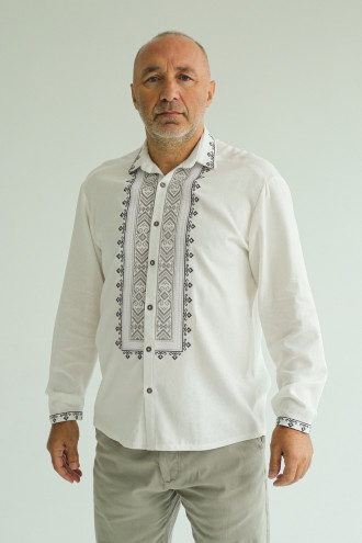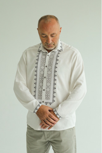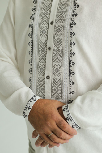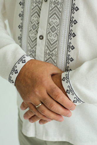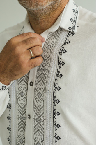 Стильна чоловіча вишита сорочка білого кольору з приємного на дотик змішаного льону з пастельним орнаментом-декором. Модель вільного фасону з відкладним комірцем на стійці, приспущеною лінією плеча, відрізною кокеткою на спинці, довгими просторими рукавами з вузькими манжетами на застібці, планкою з застібками-ґудзиками. Манишку, комір та манжети оздоблено сіро-графітовим геометричним орнаментом хрестиком та кремово-білою мережкою. Вишиванка доповнить гардеробу будь-якого чоловіка, додасть образу елегантності та особливого шарму. Убрання можна поєднувати як з офісною класикою, так і з джинсами, лляними штанами чи шортами.