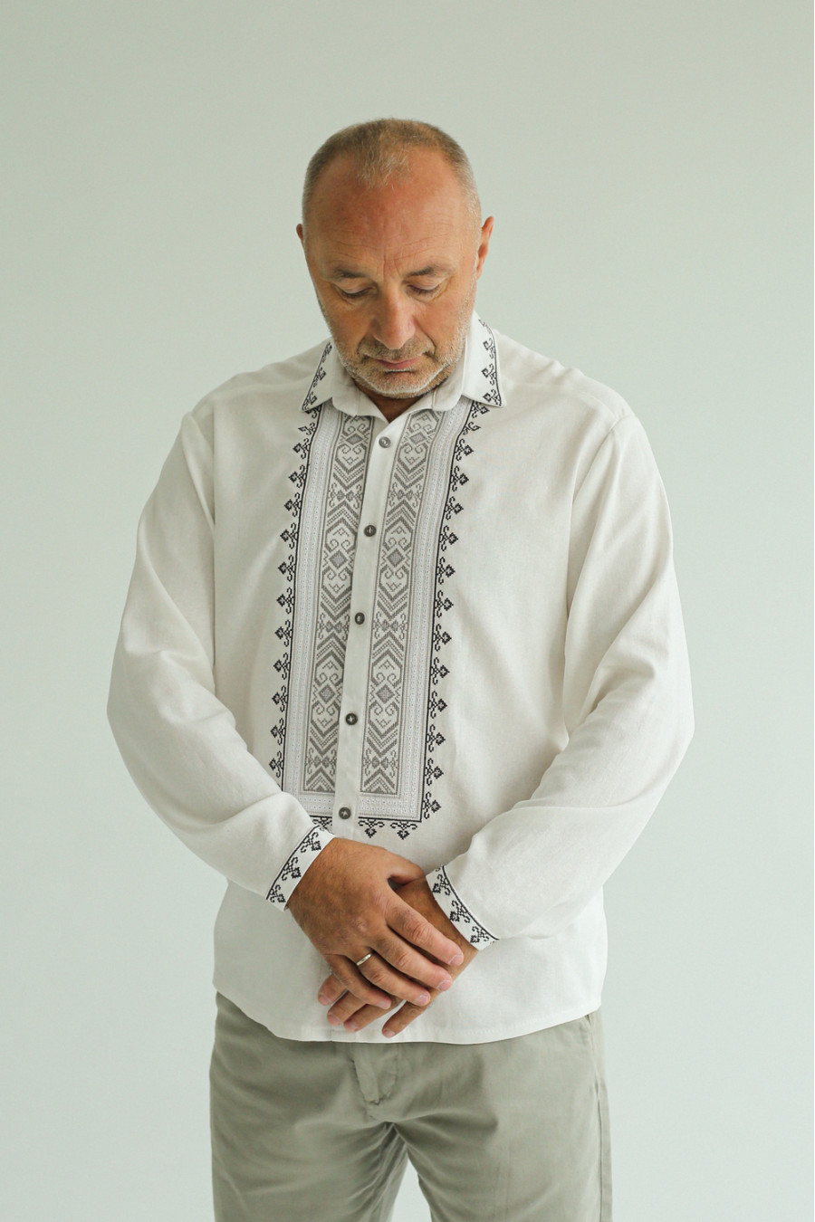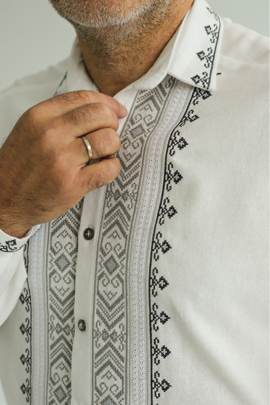 Найчастіші запитання до товару Чоловіча вишиванка «Радослав» білого кольору з сірим орнаментом: