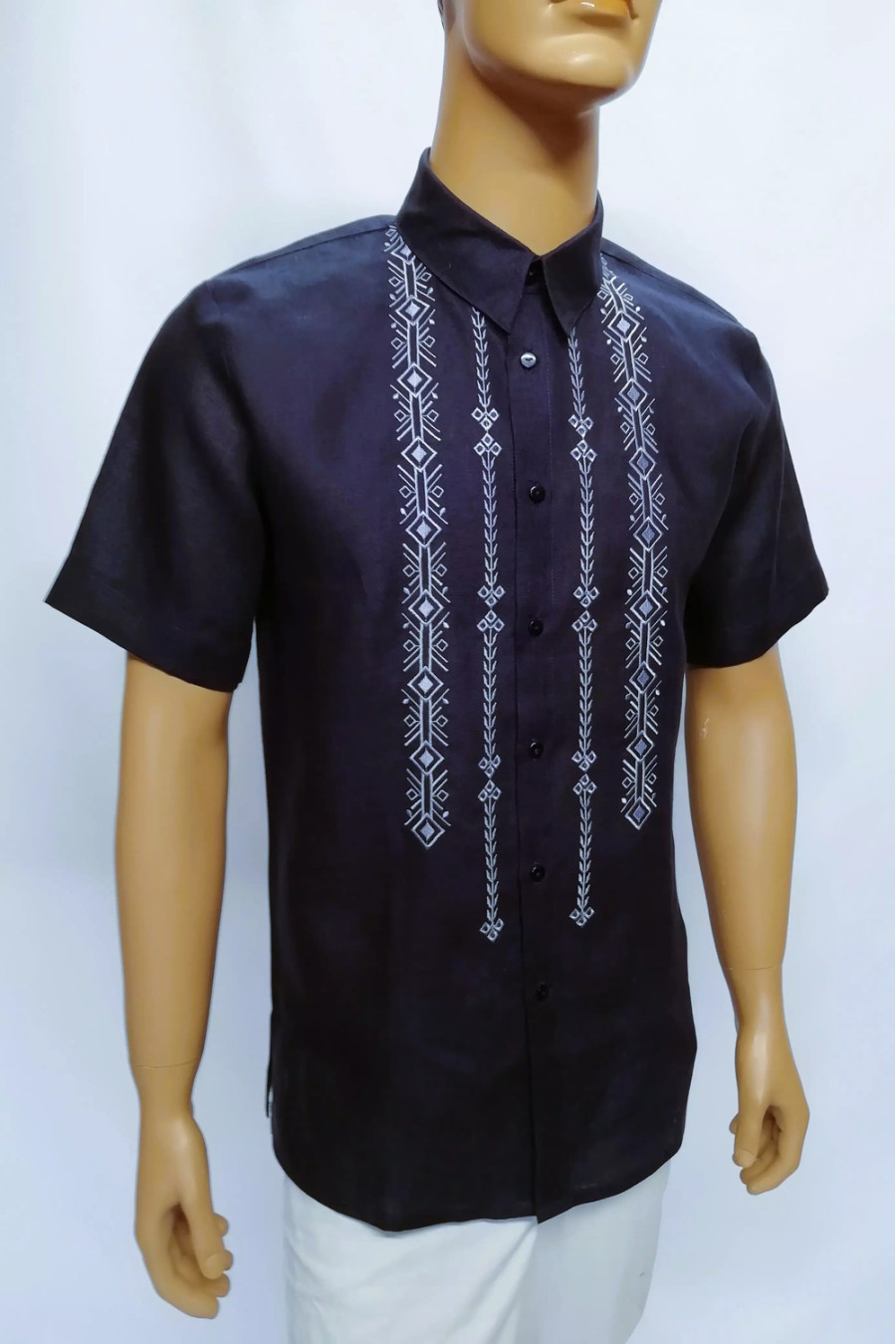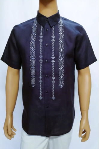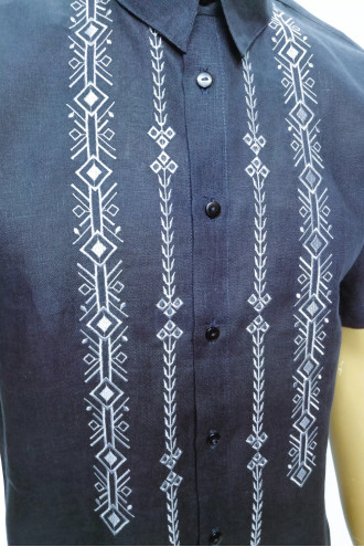 Стильна чоловіча вишиванка-теніска з приємного до тіла натурального льону глибокого темно-синього кольору з контрастним монохромним орнаментом. Модель приталеного фасону з відкладним комірцем на стійці, подовженою лінією плеча, короткими прострими рукавами, планкою з застібками-ґудзиками спереду, сорочковим подолом. Поличку декоровано вишитим гладдю геометричним орнаментом-смужками сріблясто-білого кольору. Вишиванка підкреслить елегантність та стриманість образу. Убрання вдадо поєднується і з діловим костюмом, і з джинсами чи літніми лляними брюками.
