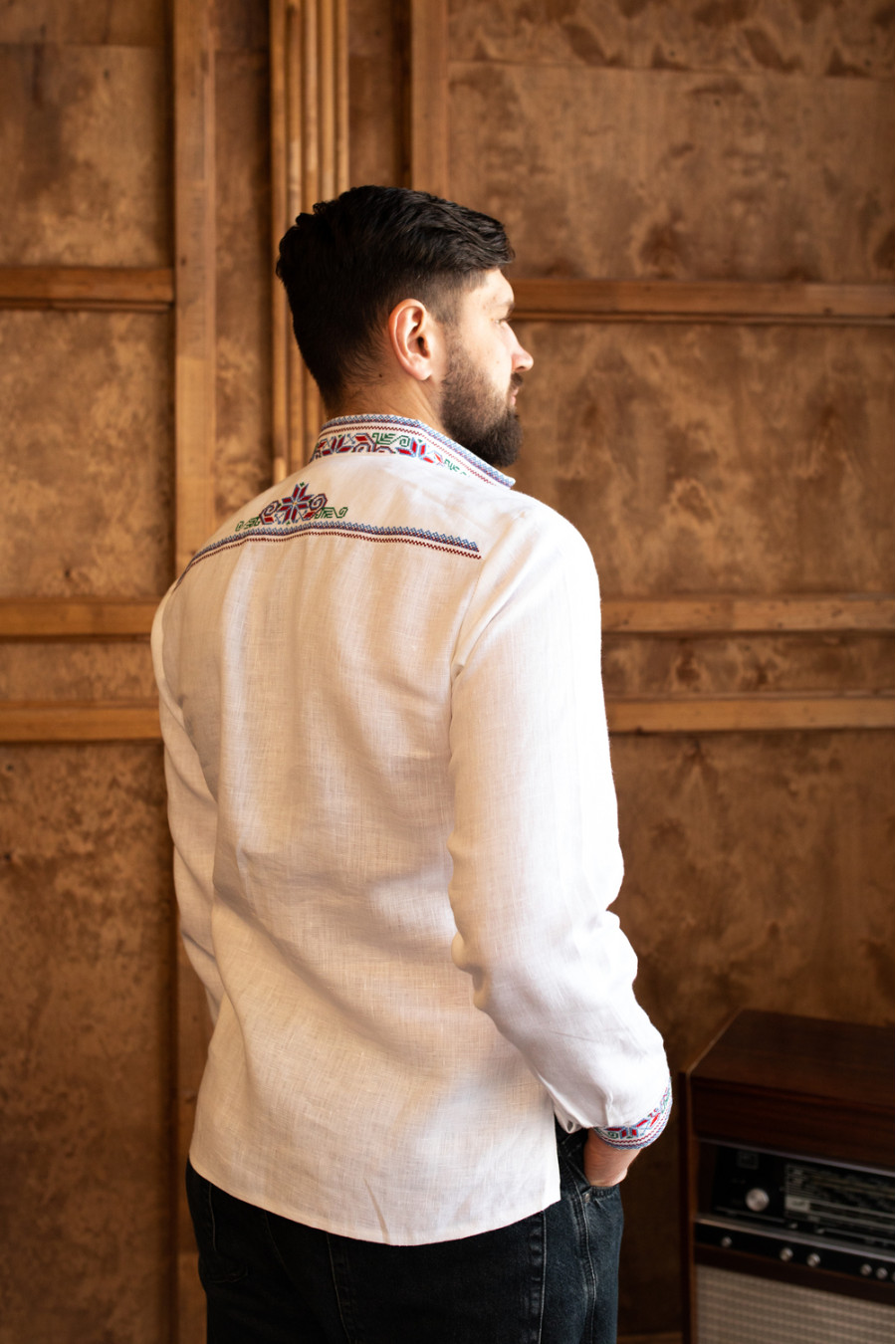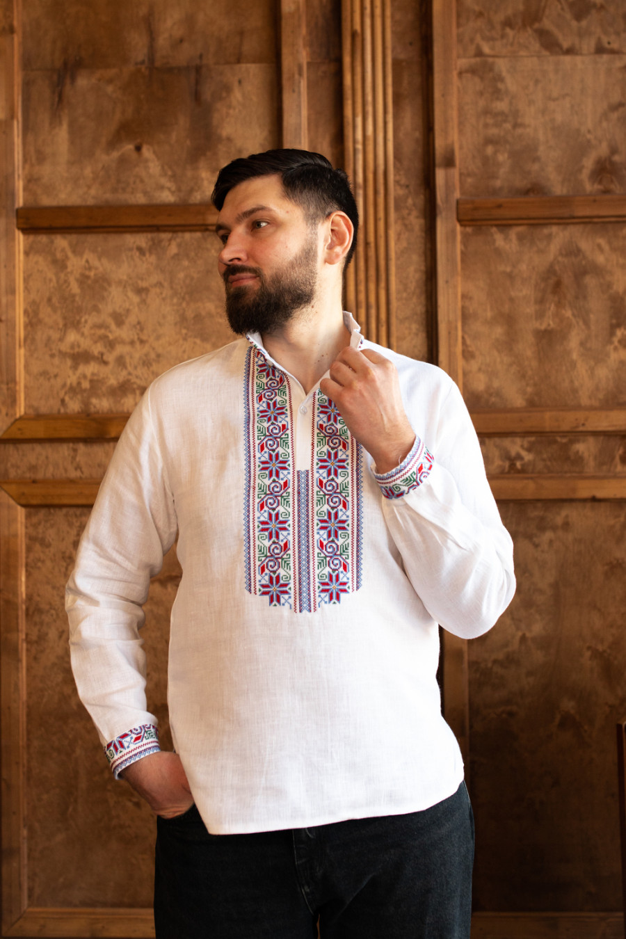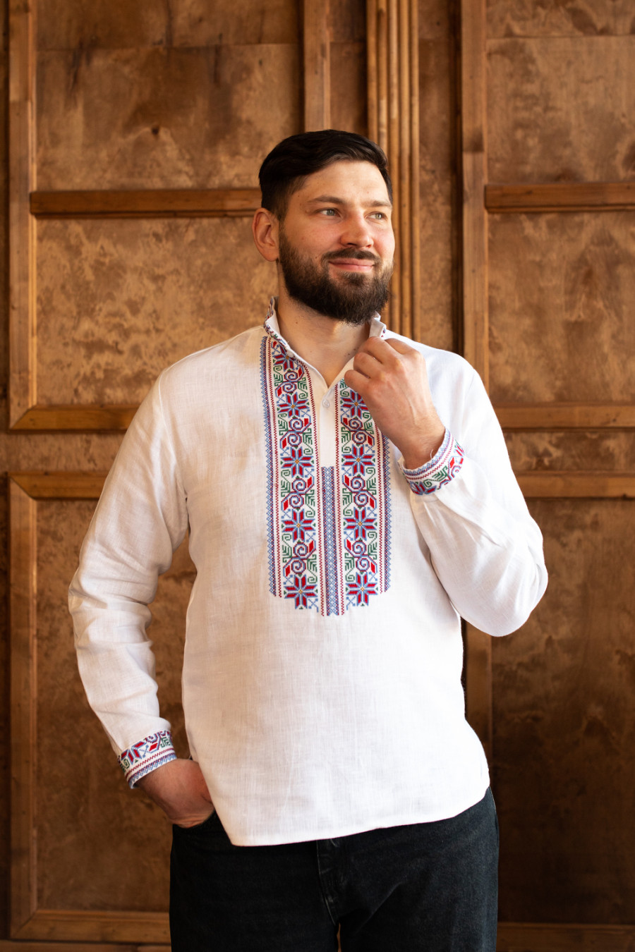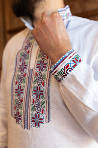Стильна біла чоловіча вишиванка з приємного до тіла натурального льону з контрастним вишитим орнаментом. Модель вільного крою з коміром-стійкою, планкою з застібками-ґудзиками на манишці, відрізною кокеткою на спинці, приспущеною лінією плеча, довгими просторими рукавами з манжетами на застібці, шліцами в бічних швах. Комір, манишку, кокетку та манжети декоровано багатоколірним геометричним орнаментом хрестиком. Вишиванка прикрасить святковий гардероб будь-якого джентльмена, додасть образу елегантності та стриманості. Убрання можна поєднувати як з діловим костюмом чи брюками, так і доповнити джинсами чи легкими лляними штанами.