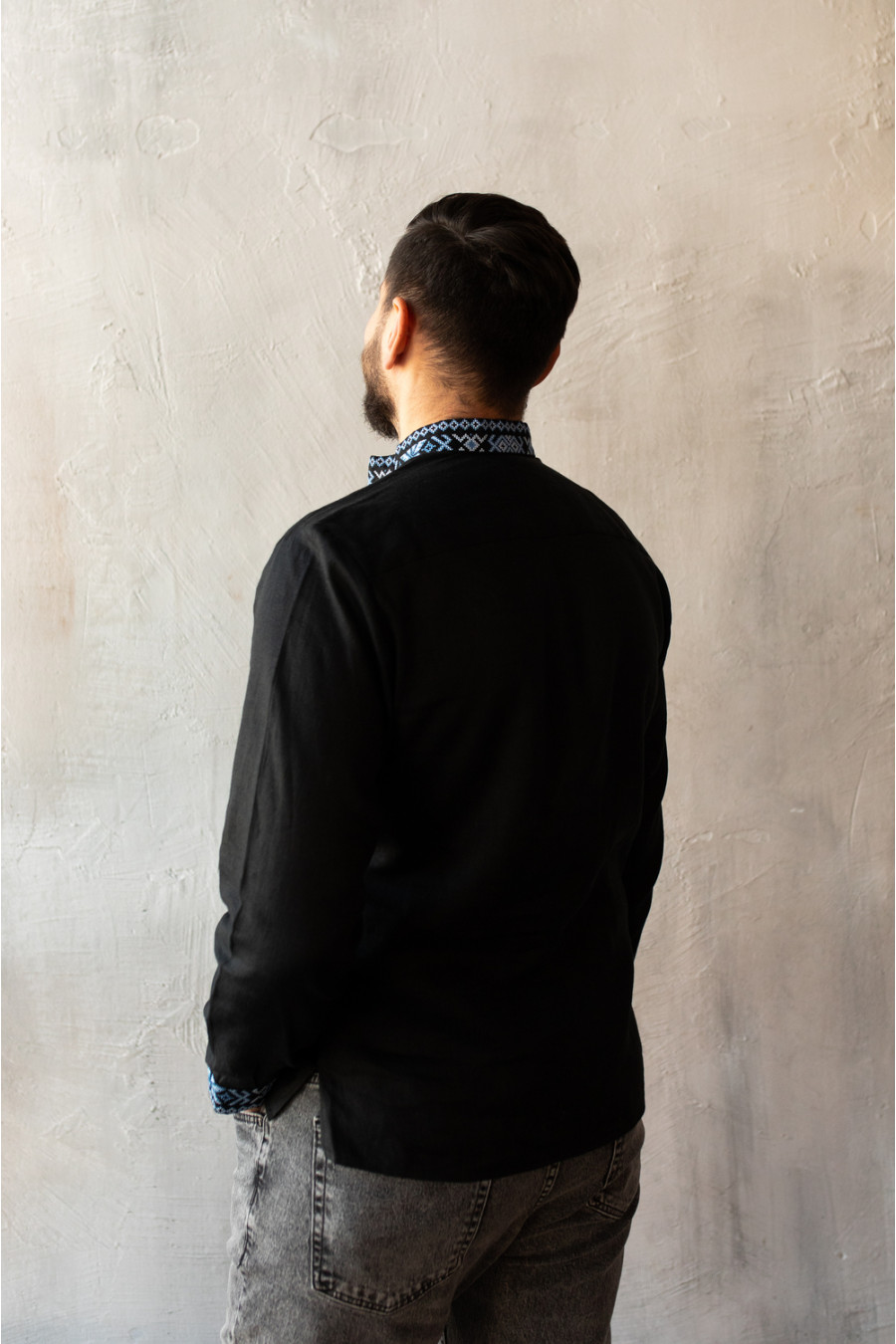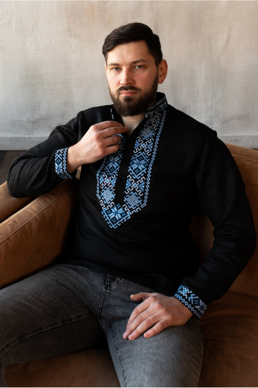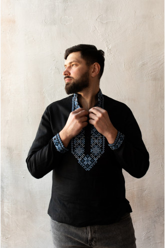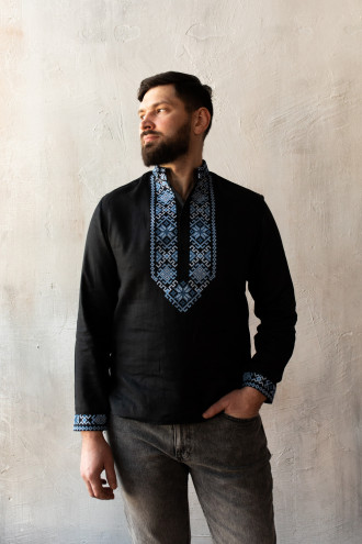 Сучасна чоловіча вишиванка з натурального чорного льону з вишитим орнаментом-декором. Модель вільного крою з коміром-стійкою, планкою з застібками-ґудзиками на манишці, відрізною кокеткою на спинці, приспущеною лінією плеча, довгими просторими рукавами з манжетами на застібці, шліцами в бічних швах. Комір, манишку, кокетку та манжети декоровано геометричним орнаментом хрестиком у синьо-блакитній гамі. Вишиванка доповнить гардероб будь-якого чоловіка, додасть образу елегантності. Убрання можна поєднувати з різноманітними варіантами низу.