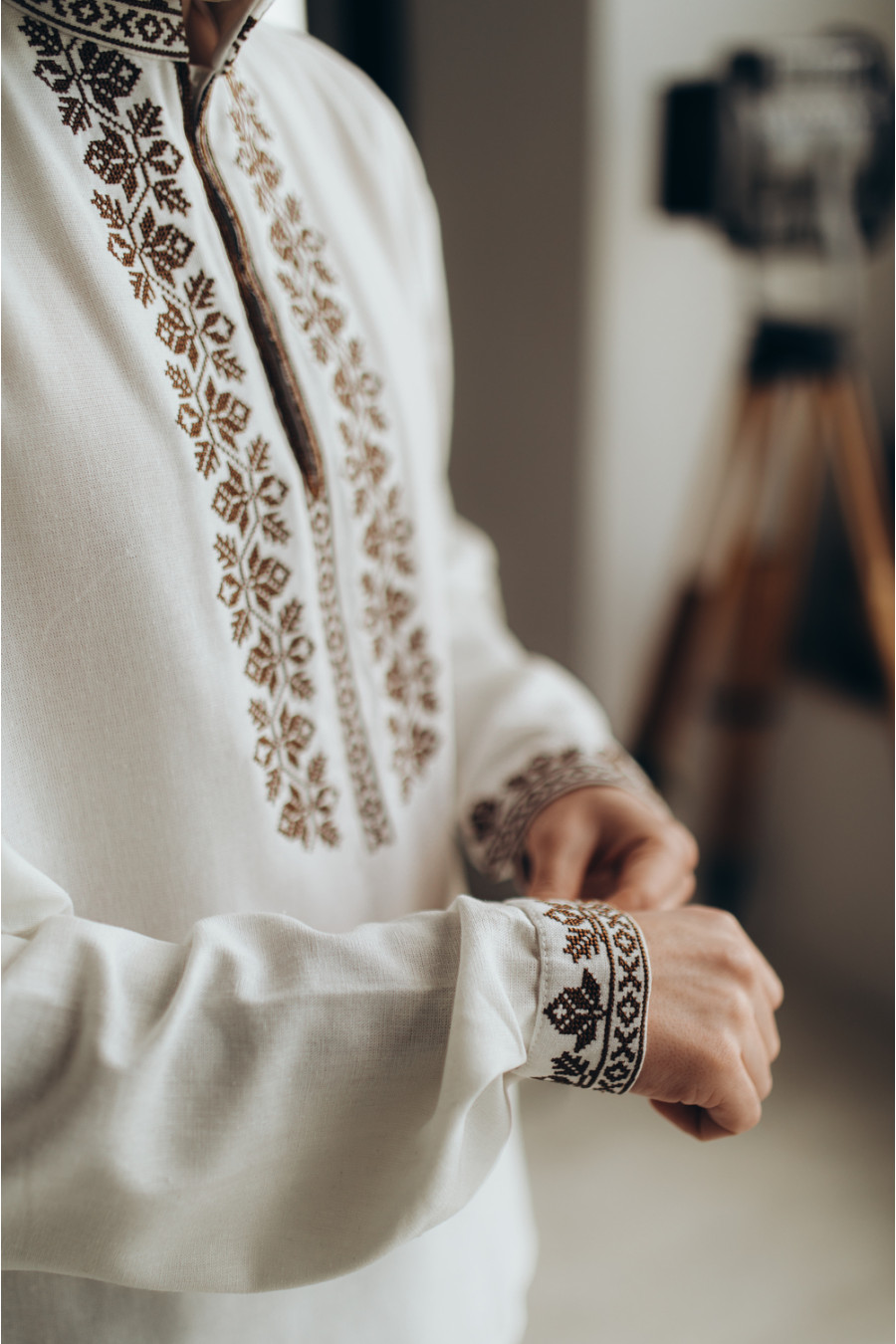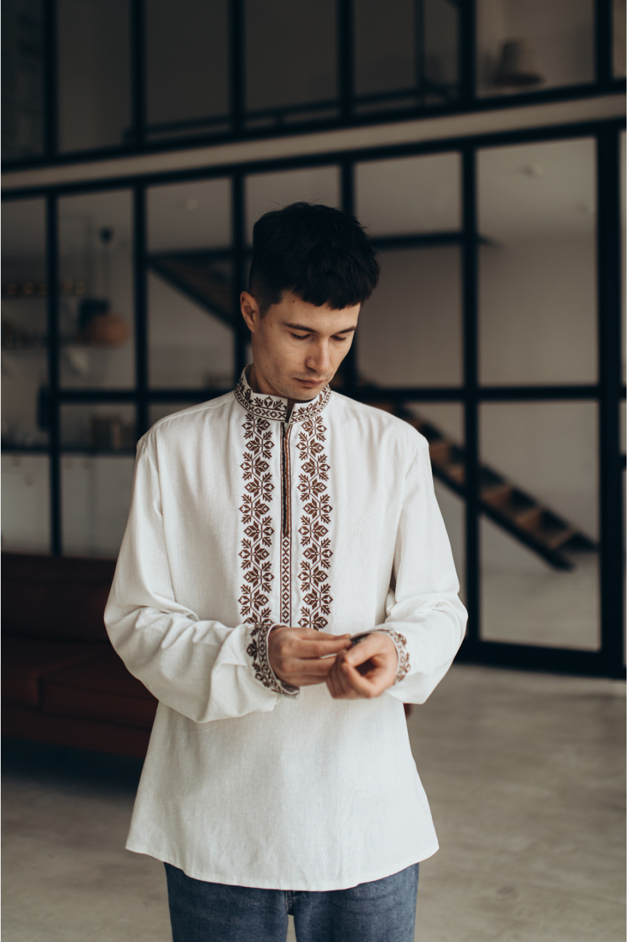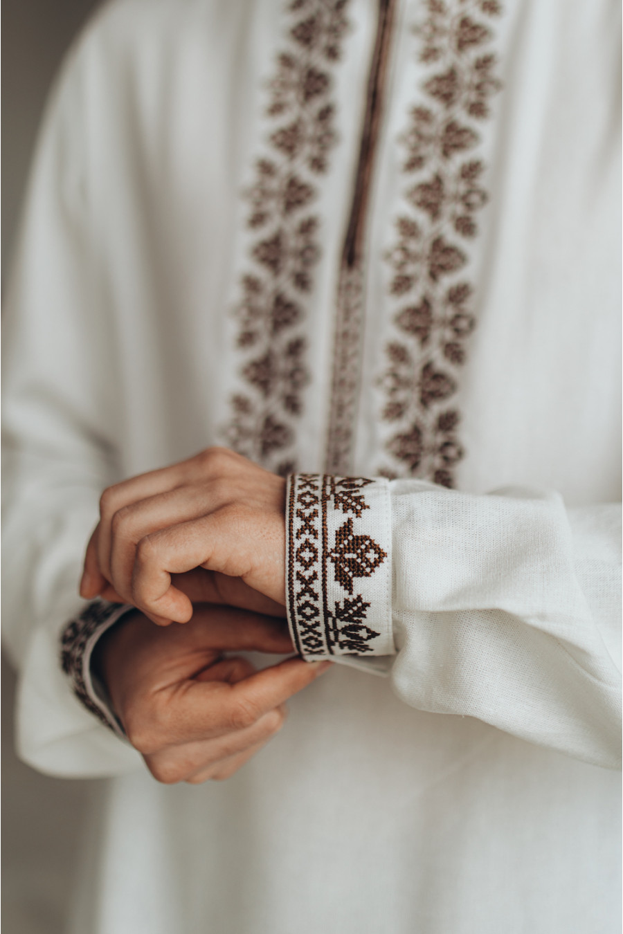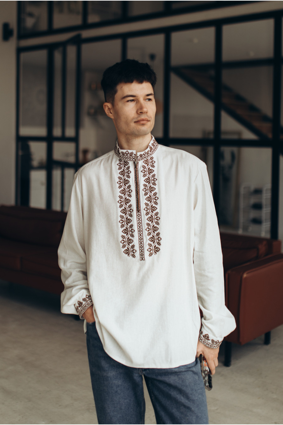 Стильна сучасна чоловіча вишиванка зі змішаної натуральної лляної тканини молочно-кремового кольору з монохромним вишитим орнаментом. Модель вільного силуету з коміром-стійкою, вирізом із потаємною застібкою на поличці, відрізною кокеткою на спинці, приспущеною лінією плеча, довгими просторими рукавами з манжетами на застібці. На комірці, манишці та манжетах розміщено вишитий хрестиком рослинний та геометричний орнамент у коричнево-кавовій гамі. Вишиванка додасть образу елегантності та стриманості. Убрання гармонійно поєднується як з діловою класикою, так і з кежуал моделями.