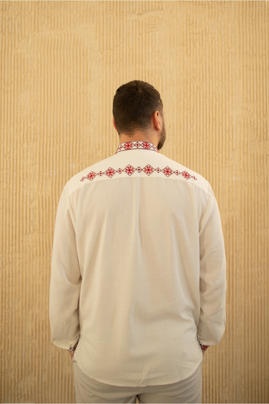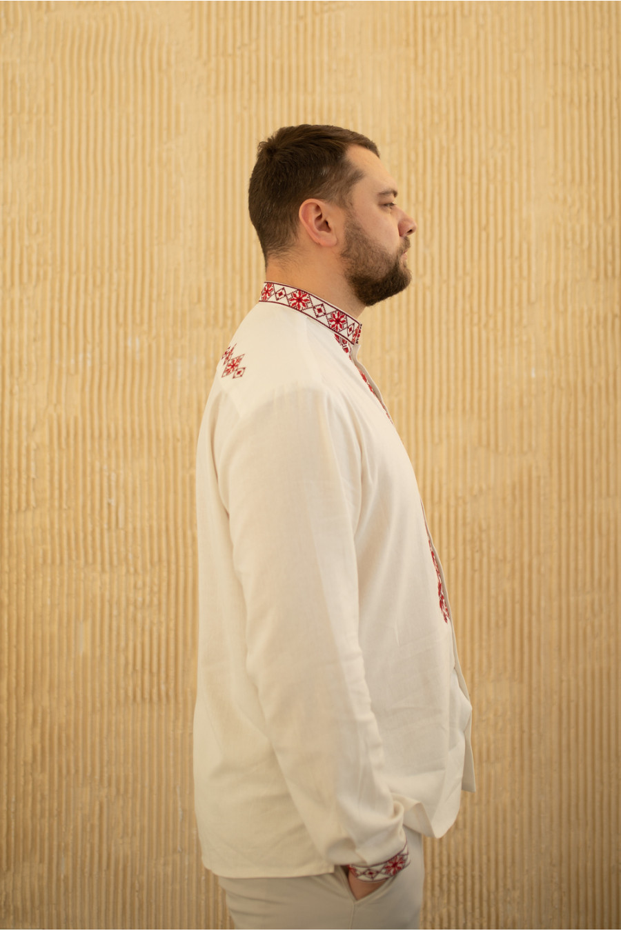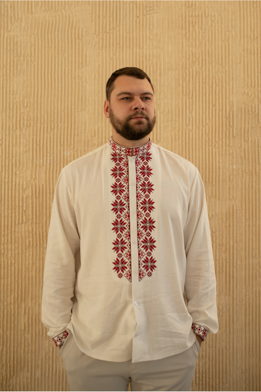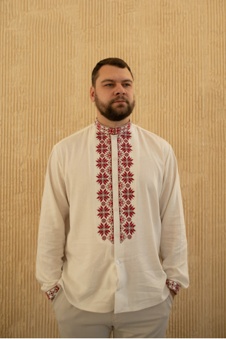 Сучасна чоловіча вишита сорочка із біло-кремового змішанного льону з контрастним вишитим орнаментом-декором. Модель вільного фасону з коміром-стійкою, відрізною кокеткою на спинці, приспущеною лінією плеча, довгими просторими рукавами з манжетами на застібці, планкою з застібками-ґудзиками на поличці, шліцами в бічних швах. Комір, поличку, кокетку та манжети прикрашає червоно-бордовий геометричний орнамент та в'язь хрестиком. Вишиванка освіжить чоловічий гардероб, додасть образу вишуканості та стильності. Убрання вдало поєнується і з офісним низом, і з джинсами чи шортами.