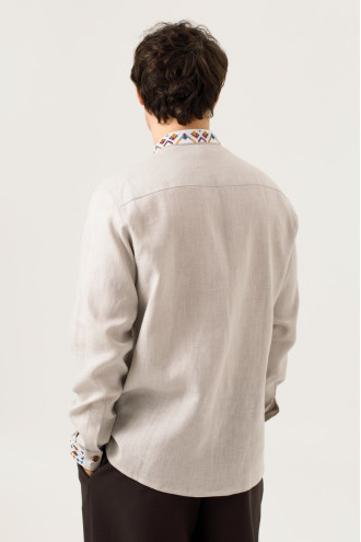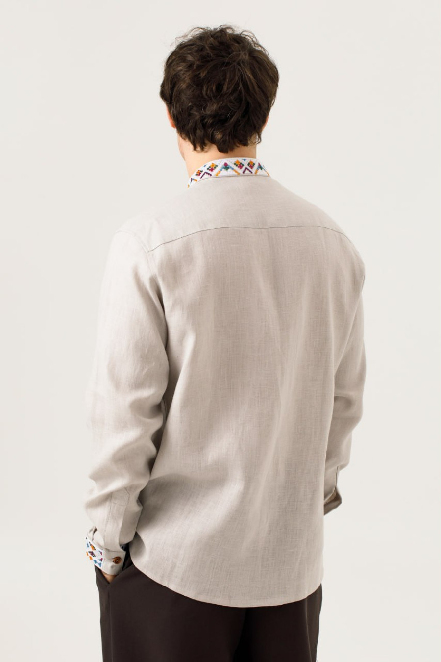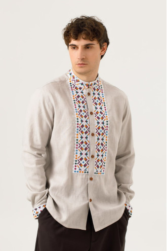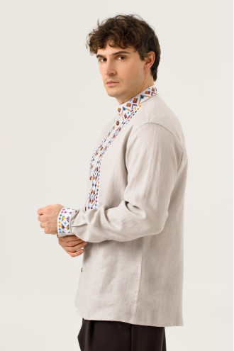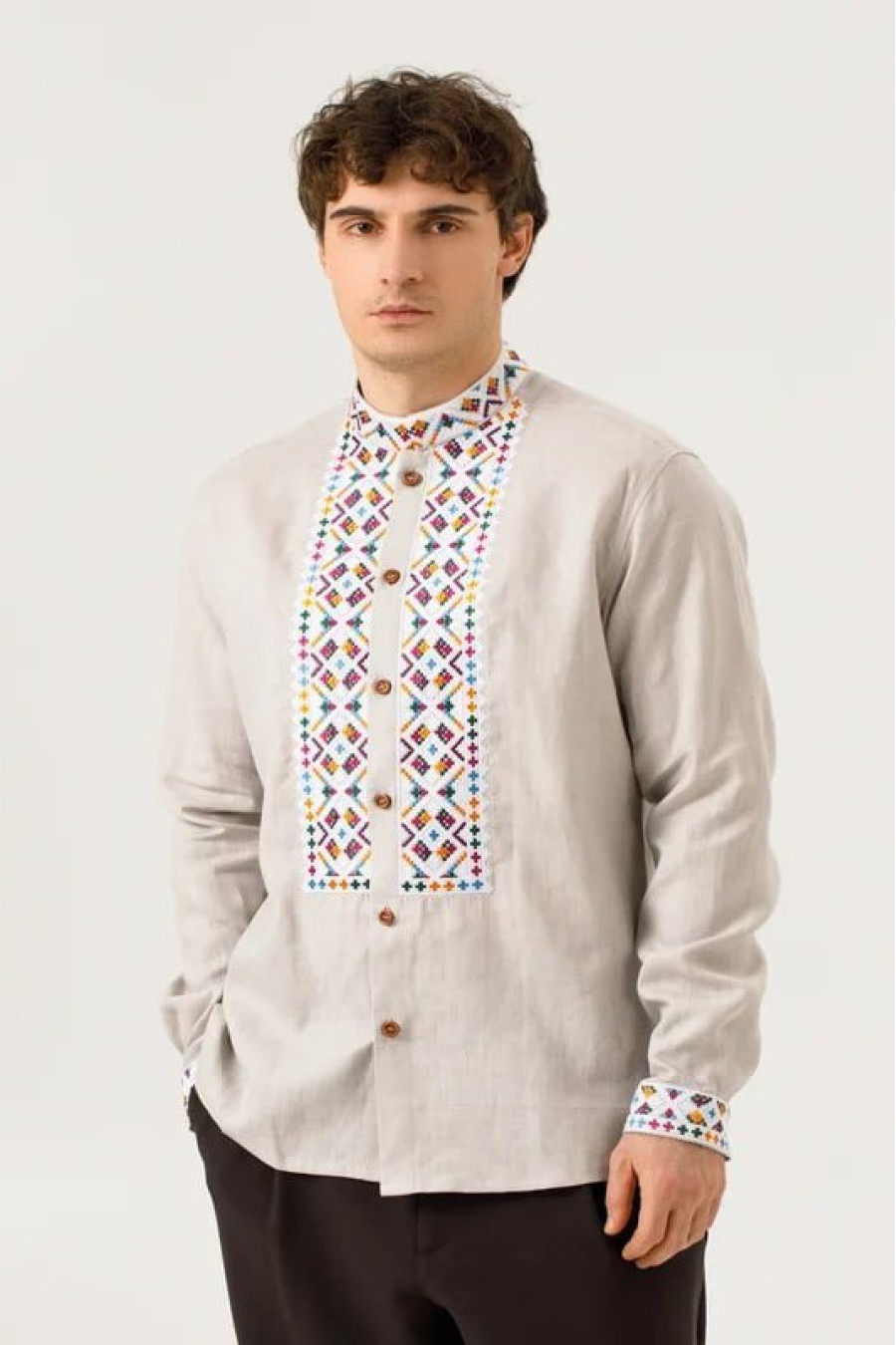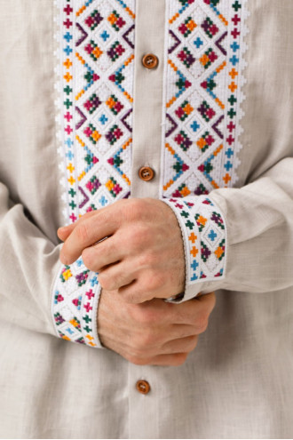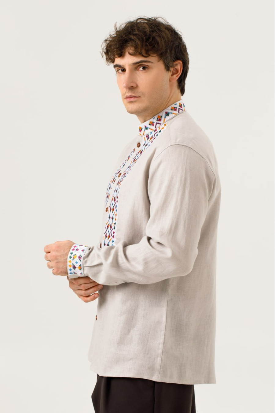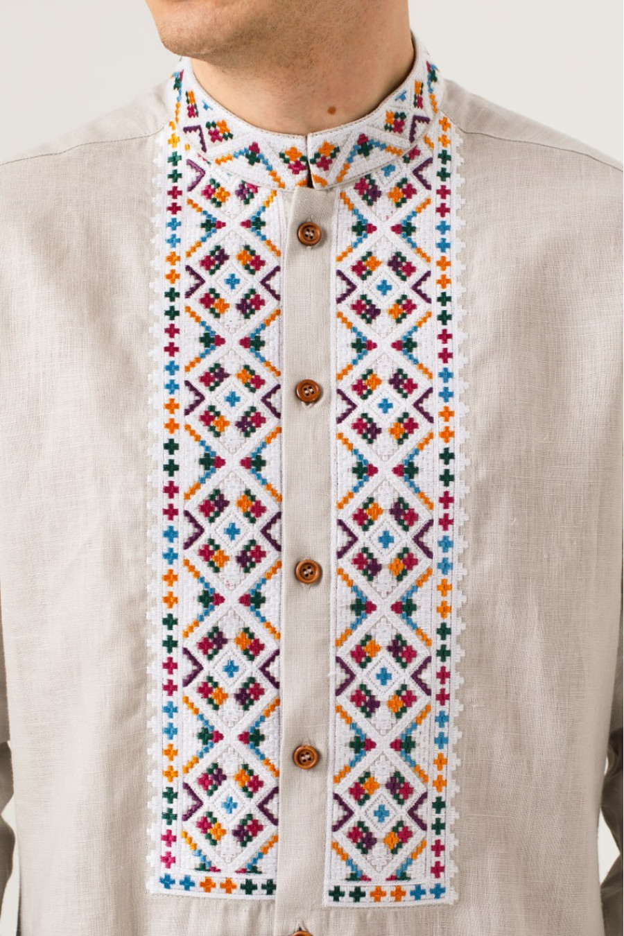 Елегантна чоловіча вишита сорочка з приємного до тіла натурального льону сіро-бежевого кольору з різнобарвним орнаментом-декором, що поєднує сучасність та автентичність. Модель вільного фасону з комірцем-стійкою, відрізною кокеткою на спинці, приспущеною лінією плеча, довгими втачними рукавами з манжетами на застібці, планкою з дерев'яними застібками-ґудзиками. Комір, манишку та манжети декоровано барвистим геометричним орнаментом гладдю на білому тлі. Вишиванка додасть святковому образу стильності та оригінальності. Убрання можна поєднувати і з діловим костюмом, і з джинсами. На бажання, можна створити парний образ з однойменною жіночою вишиванкою.