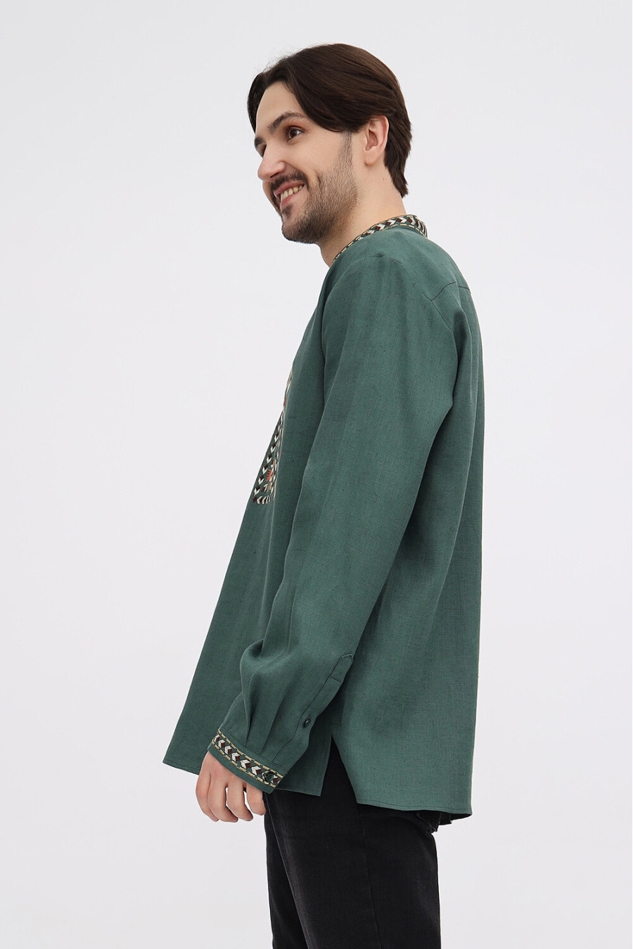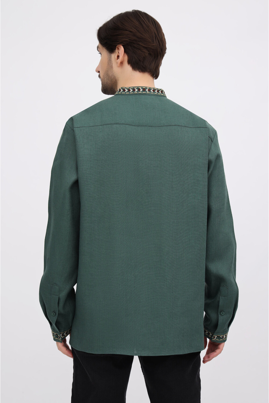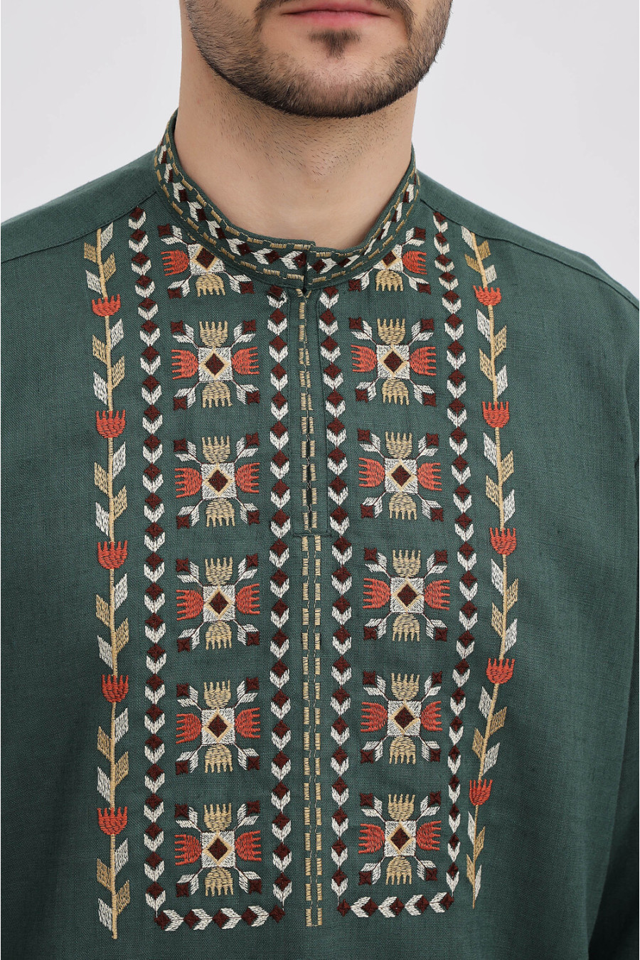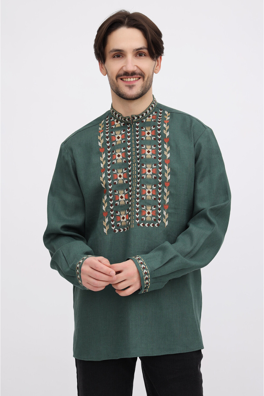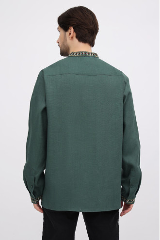 Лляна чоловіча вишиванка з натуральної тканини темно-смарагдового кольору з барвистим вишитим орнаментом-декором. Модель вільного фасону з комірцем-стійкою, вирізом із потаємною застібкою-ґудзиком, відрізною кокеткою, приспущеною лінією плеча, довгими просторими рукавами з манжетами на застібці, шліцами в бічних швах. Манишку, комірець та манжети оздоблено багатоколірним геометричним та рослинним орнаментом гладдю. Вишиванка доповнить чоловічий гардероб, додасть образу ошатності та стильності. Убрання можна доповнити як низом у діловому, так і в кежуал стилі. На бажання, можна створити парний образ із сукнею Єремія.