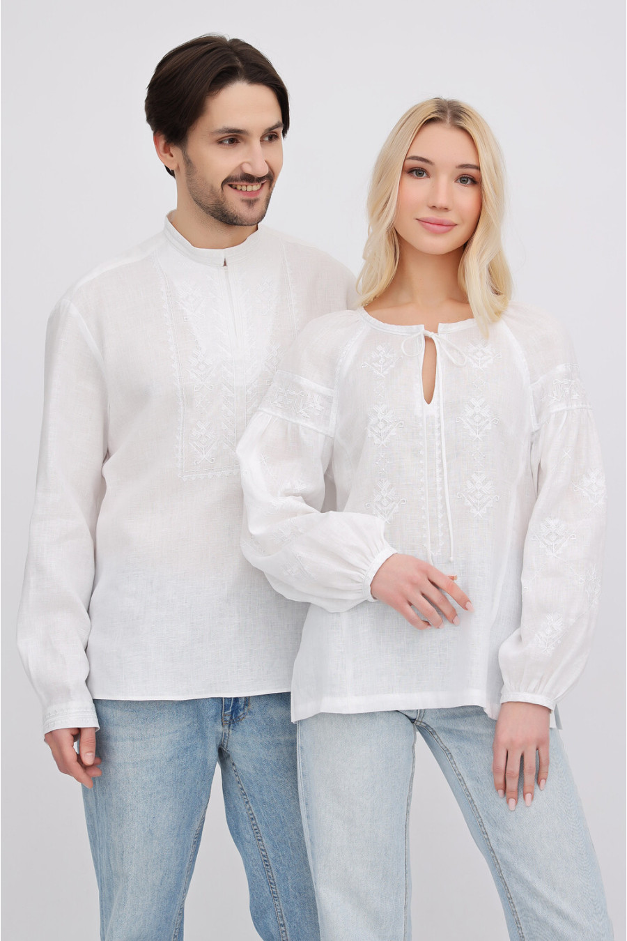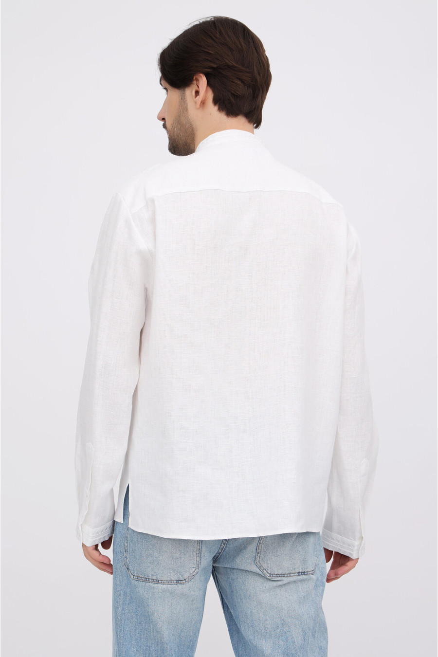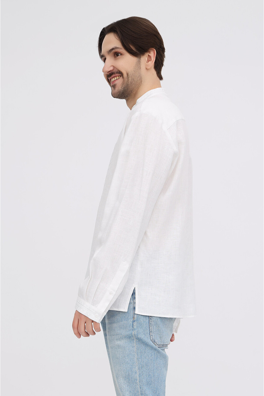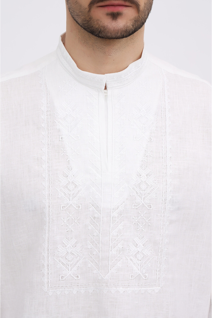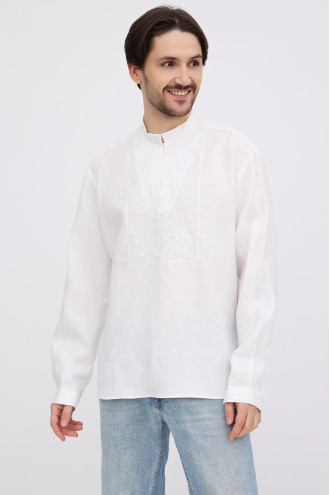 Елегантна сучасна чоловіча вишиванка "білим по білому" з натурального льону з вишитим орнаментом-декором. Модель вільного силуету з невисоким коміром-стійкою, вирізом із потаємною застібкою-ґудзиком, відрізною кокеткою на спинці, приспущеною лінією плеча, просторими довгими рукавами з манжетами на застібці, шліцами в бічних швах. Манишку, комірець та манжети декоровано геометричним орнаментом та в'яззю гладдю. Вишиванка прикрасить образ, додасть йому вишуканості та шарму. Убрання вдало поєднується з різноманітними варіантами низу. Також можна створити парний образ із вишиванкою Міряна.