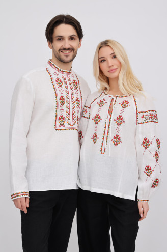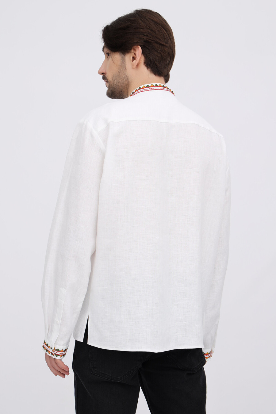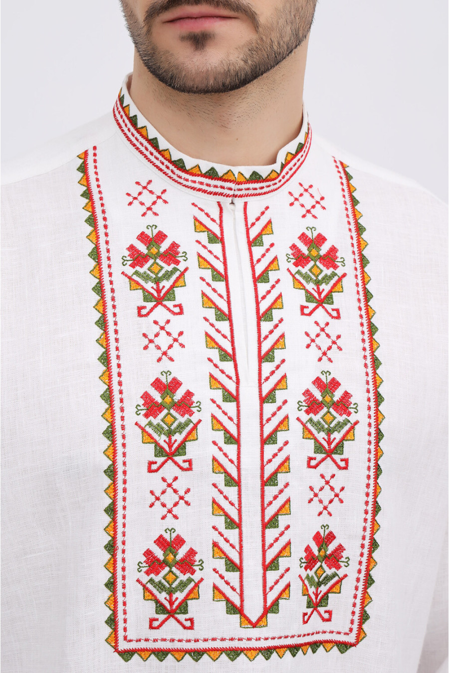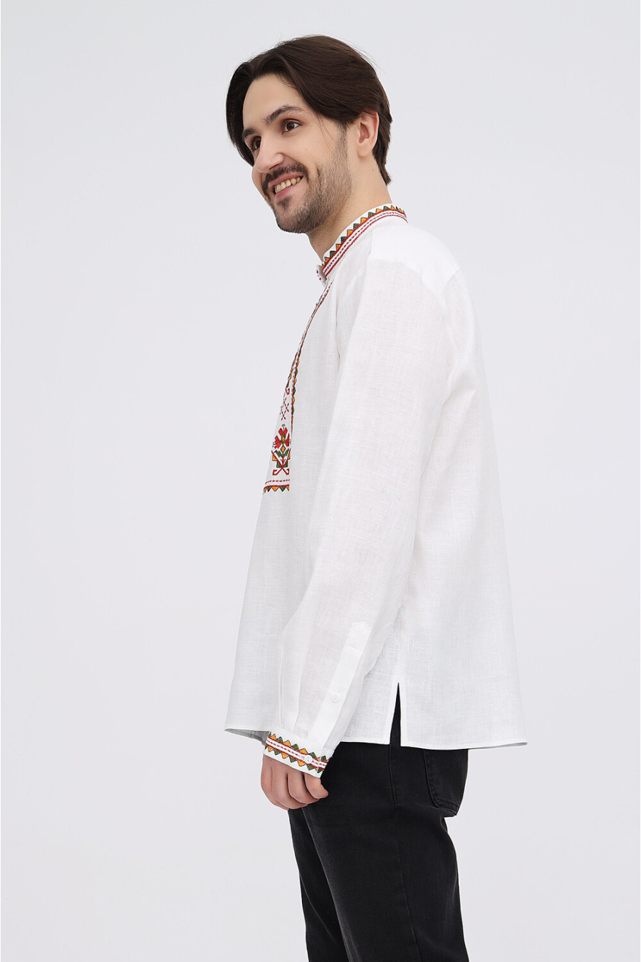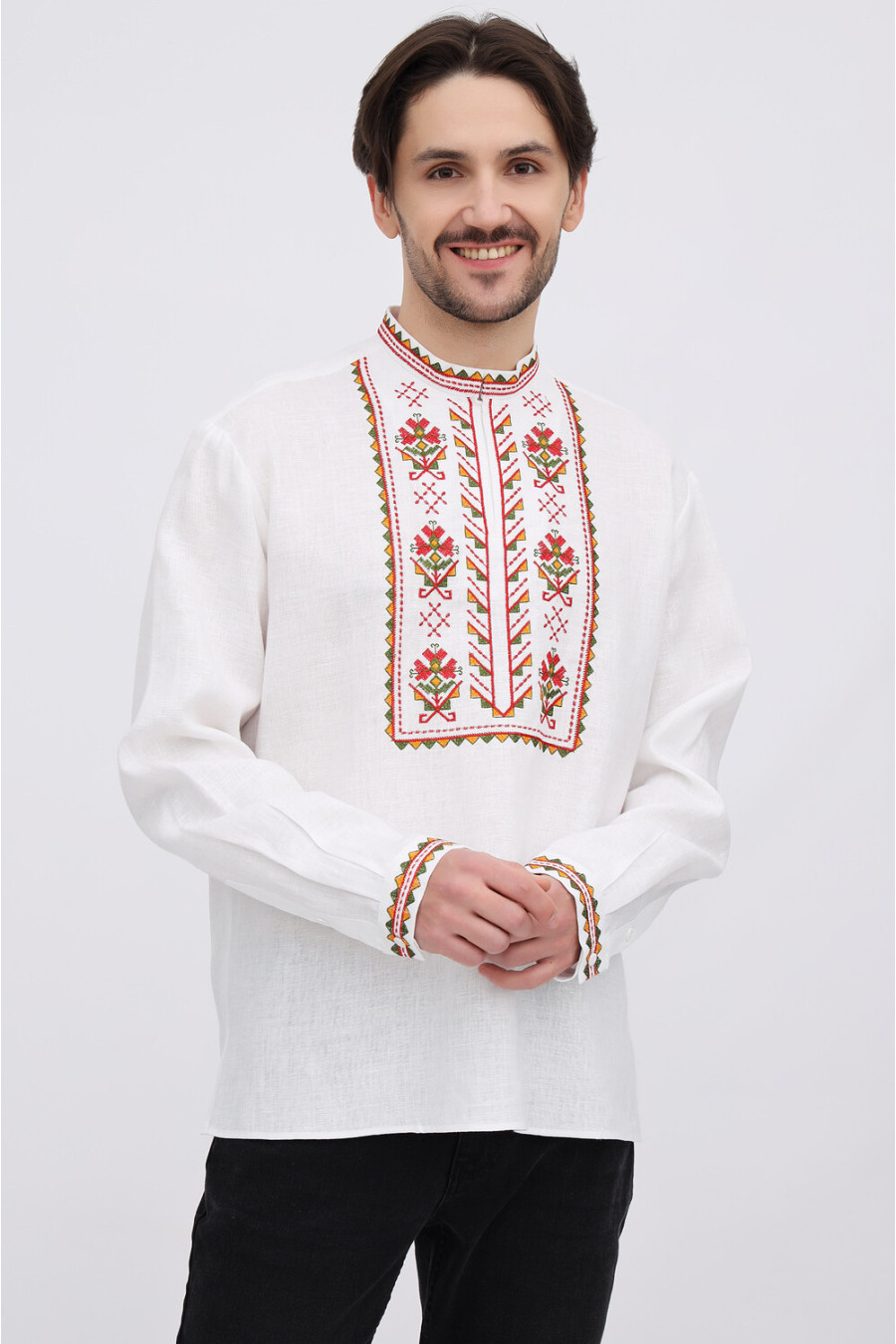 Сучасна чоловіча вишиванка з натурального льону білосніжного кольору з барвистим контрастним вишитим орнаментом-декором. Модель вільного силуету з невисоким коміром-стійкою, вирізом із потаємною застібкою-ґудзиком, відрізною кокеткою на спинці, приспущеною лінією плеча, просторими довгими рукавами з манжетами на застібці, шліцами в бічних швах. Манишку, комірець та манжети декоровано геометричним орнаментом та в'яззю гладдю в червоно-жовто-оливковій гамі. Вишиванка прикрасить образ, додасть йому вишуканості та шарму. Убрання вдало поєднується з різноманітними варіантами низу. Також можна створити парний образ із вишиванкою Міряна.