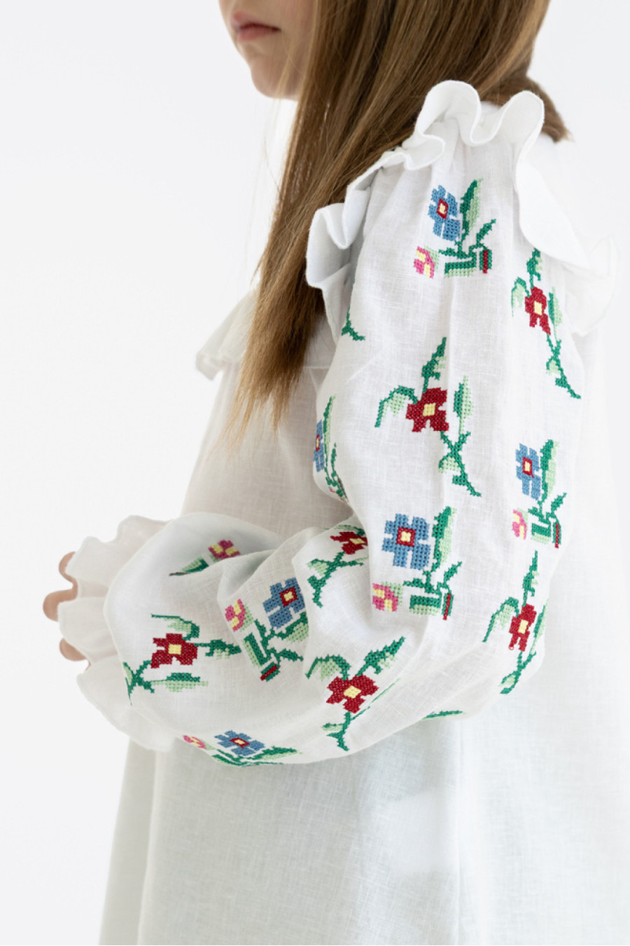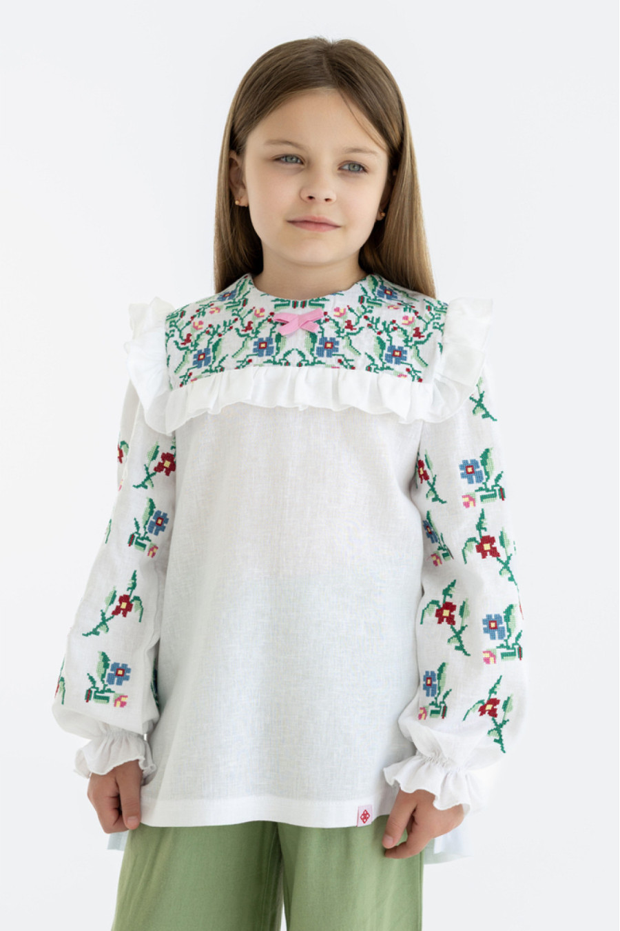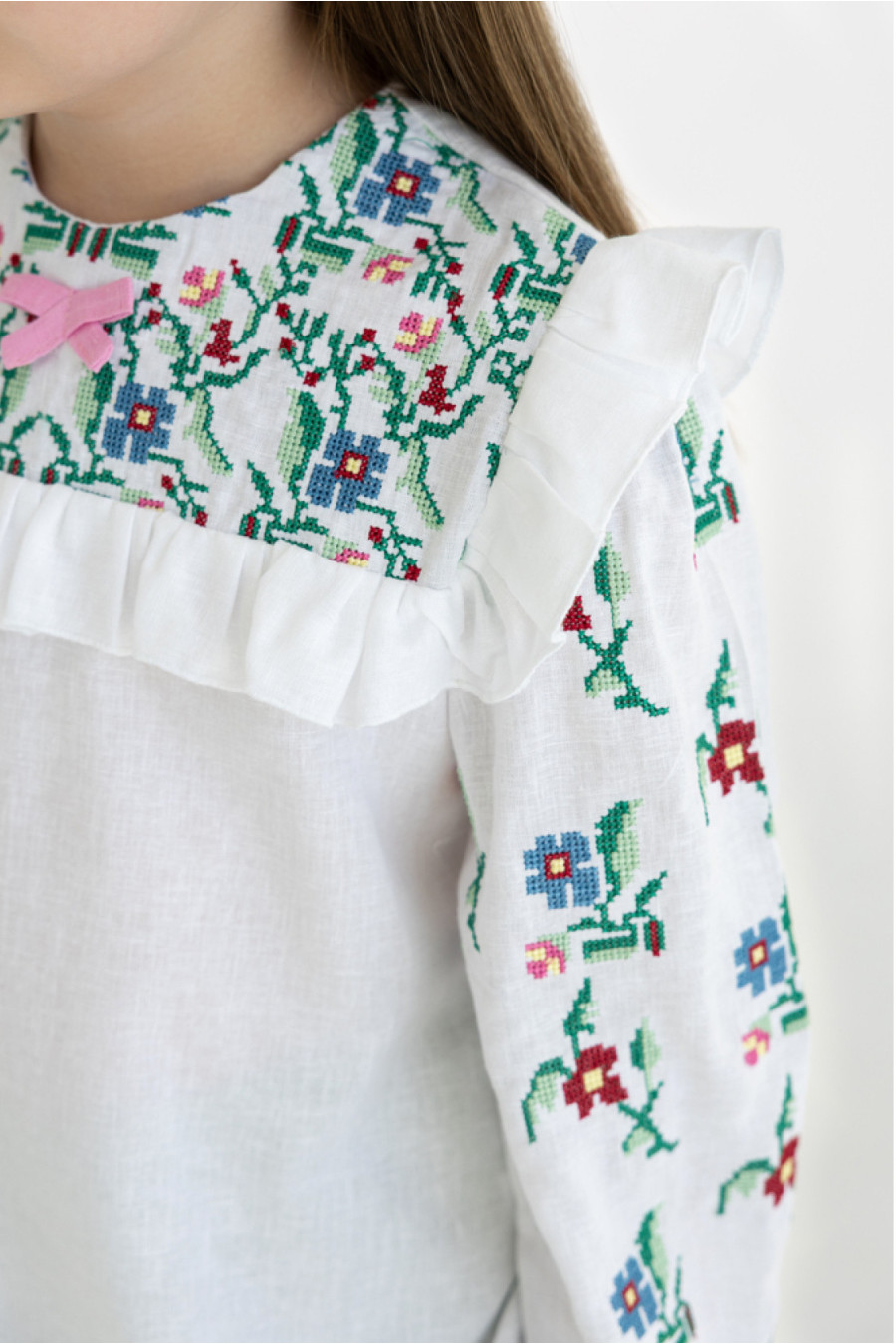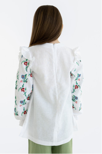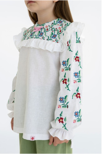 Чарівна сучасна вишиванка для дівчинки зі змішаної лляної тканини білого кольору з контрастним вишитим орнаментом та декором-бантиком. Модель вільного фасону з подовженою спинкою, округлою горловиною, відрізною кокеткою зі зборками на поличці, довгими просторими рукавами з рюшем біля плечей та манжетами-воланами на резинці, потаємною застібкою-блискавкою на спинці, шліцами в бічних швах. Кокету та рукави оздоблено барвистим квітковим орнаментом хрестиком. Вишиванка підкреслить ніжність та легкість образу, додасть йому грайливості. Убрання буде доречним для будь-якої подіїі.