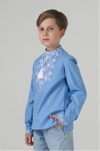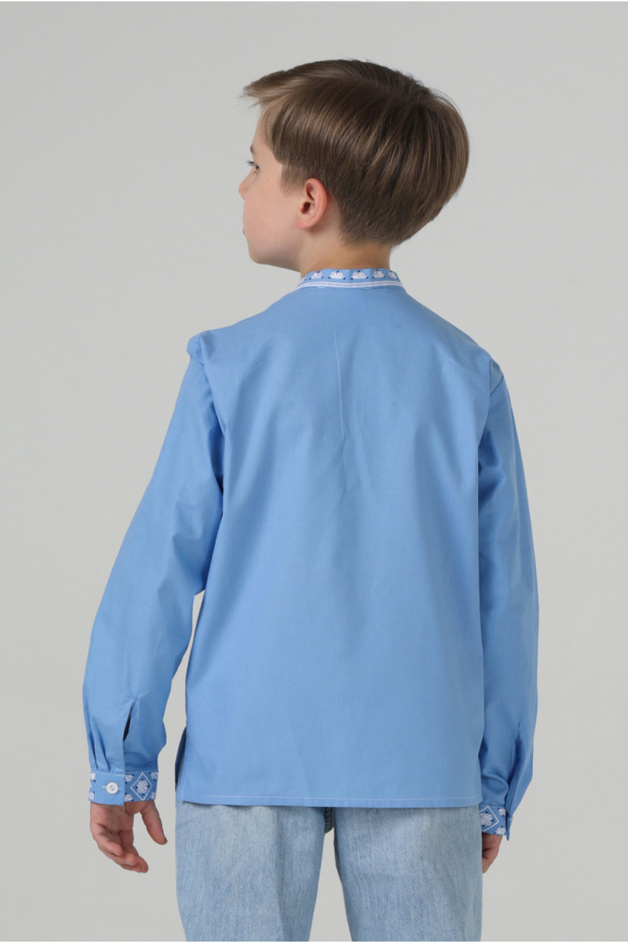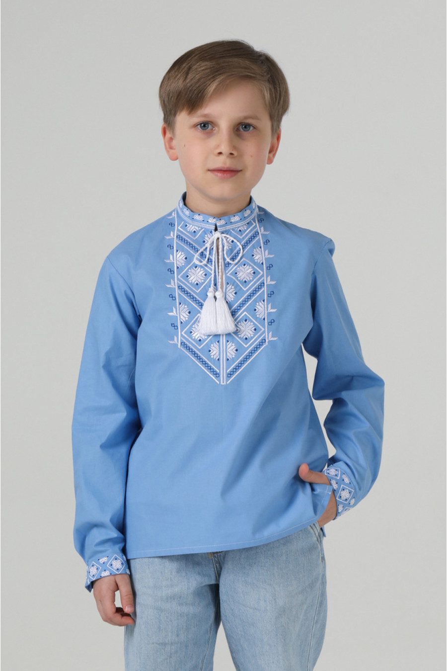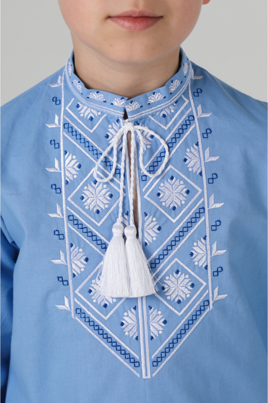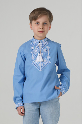 Темно-блакитна сучасна вишиванка для хлопчика з приємної до тіла легкої сорочкової тканини з лаконічним вишитим декором. Модель вільного крою з невеликим комірцем-стійкою, вирізом з зав'язками-кутасиками, приспущеною лінією плеча, довгими просторими рукавами з манжетами на застібці, шліцами в бічних швах. Комір, манишку та манжети декоровано біло-кремовим та синім геометричним орнаментом гладдю. Вишиванка додасть образу ошатності та елегантності. Убрання можна поєднувати як зі шкільними брюками, так і з джинсами чи шортами.