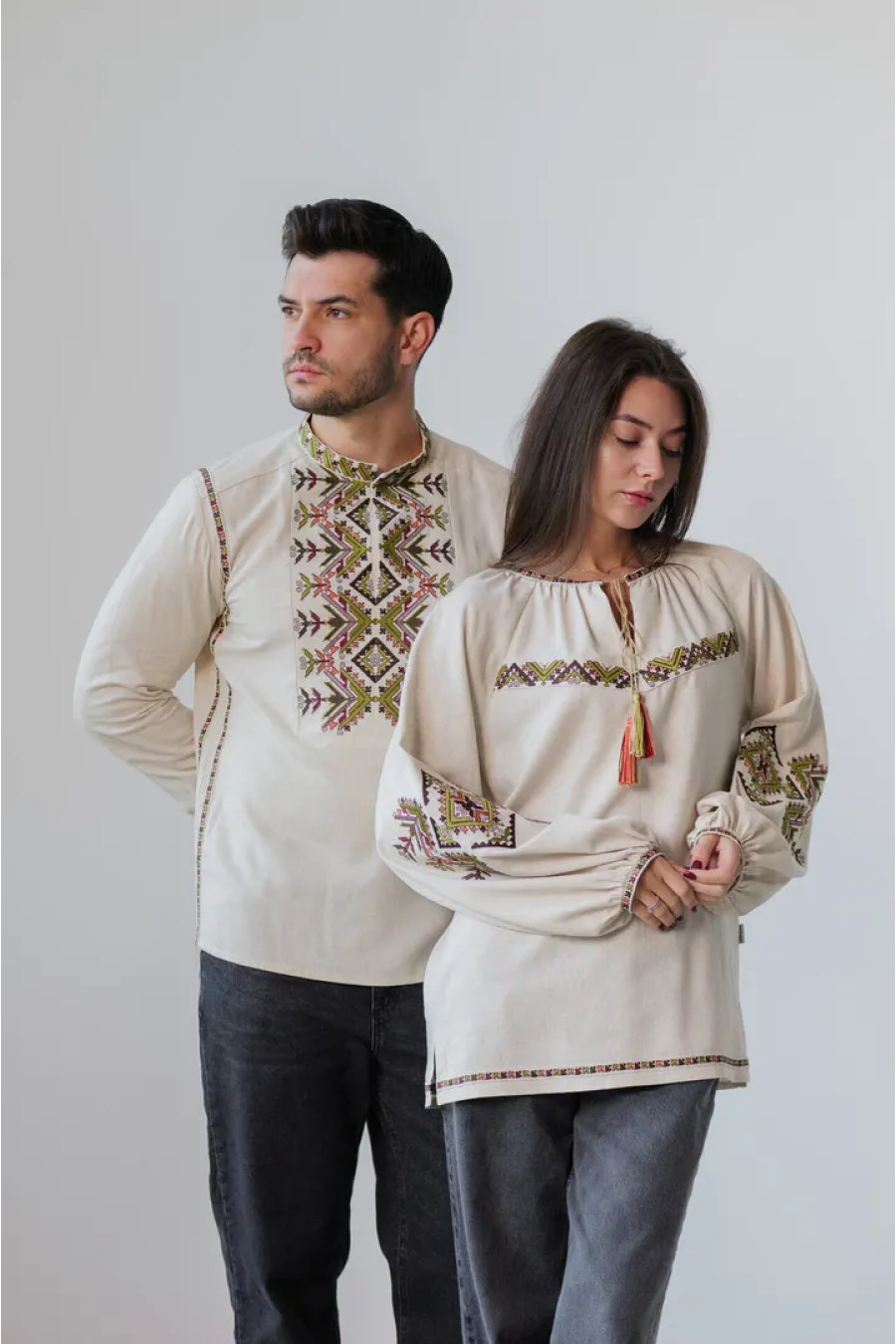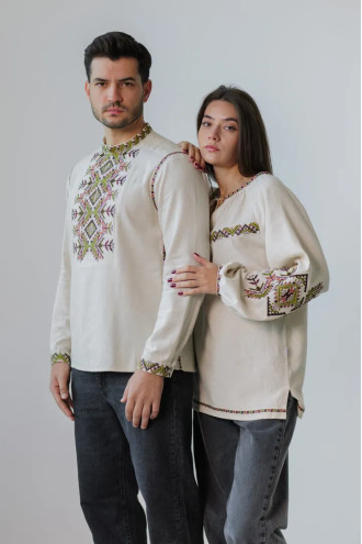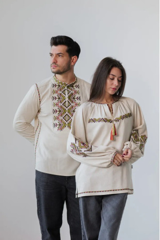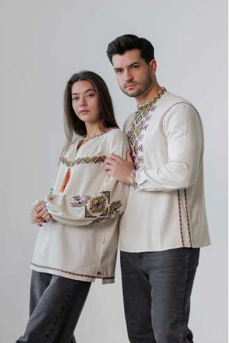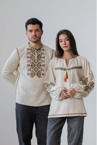 Вишитий парний комплект бежево-лляних вишиванок «Батьківський дар» з барвистим вишитим декором.