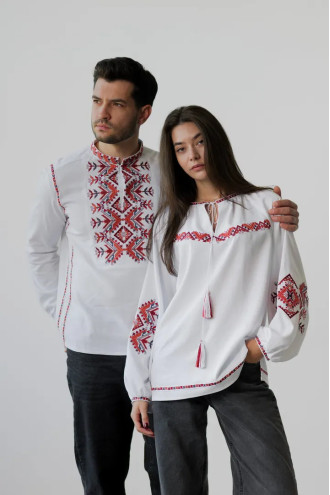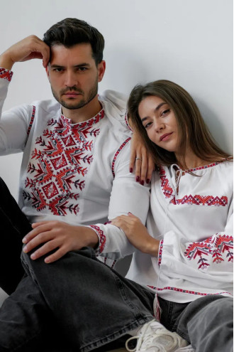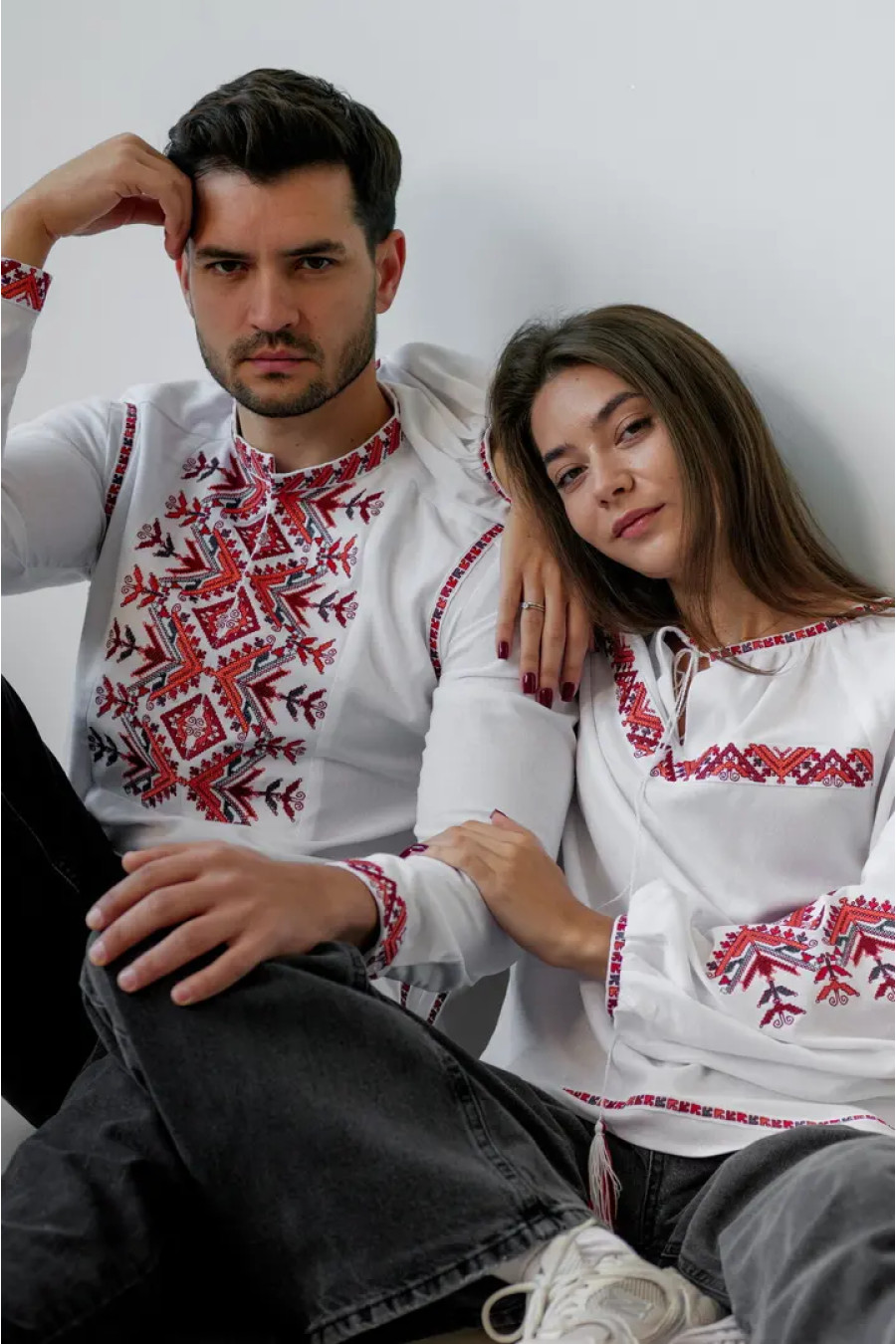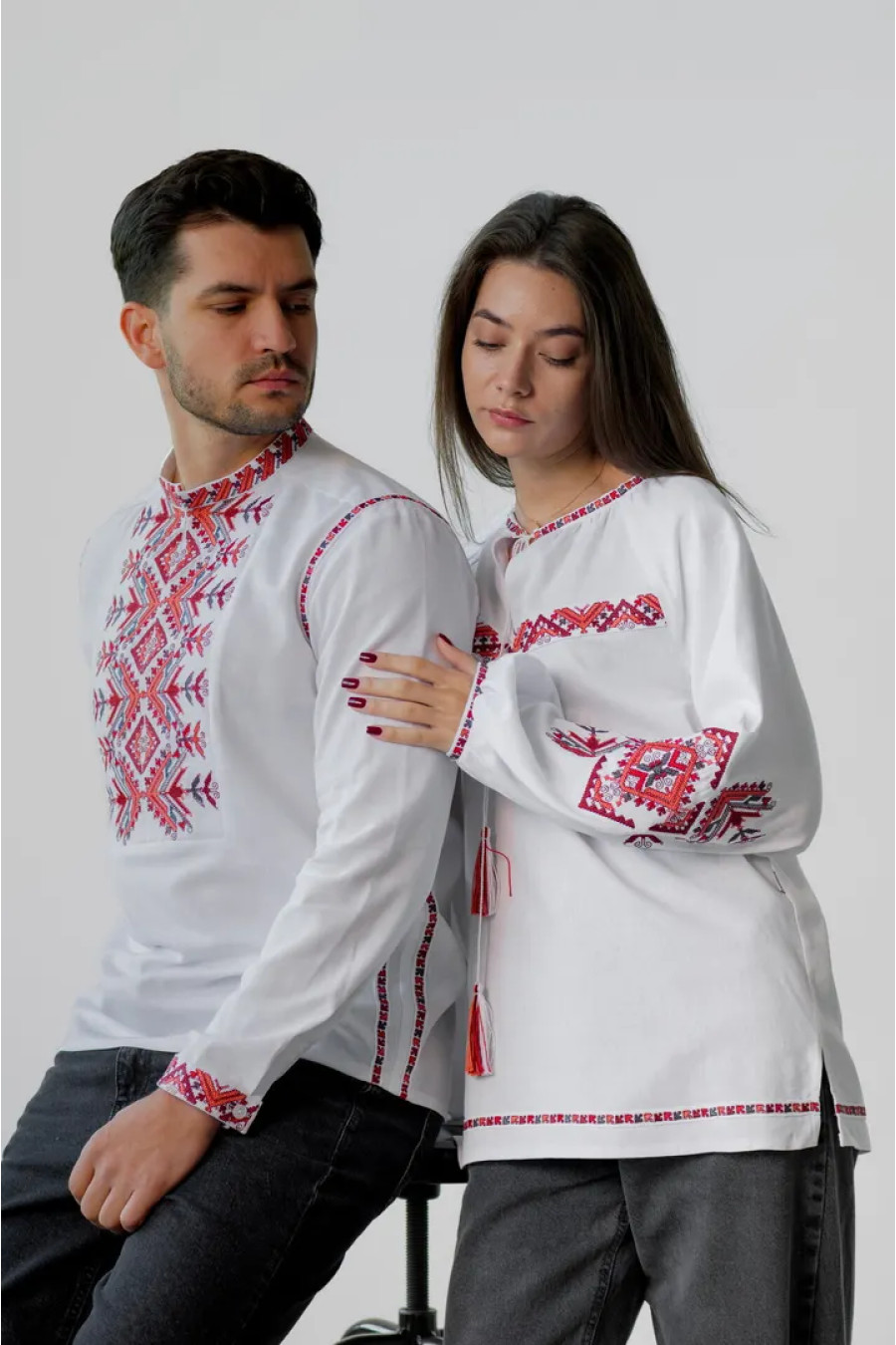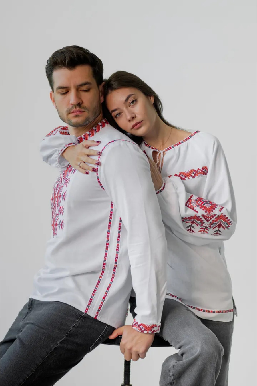 Білосніжний вишитий парний комплект вишиванок «Батьківський дар» зі змішаного льону з барвистим вишитим декором.