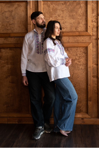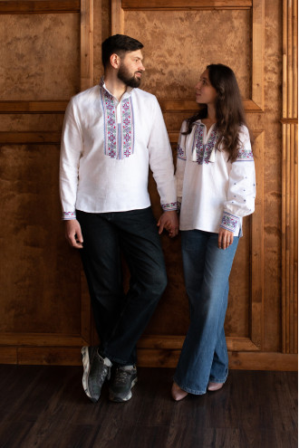 Вишитий парний лляний комплект вишиванок у сучасному стилі «Зорі на світанку» білосніжного кольору з барвистим орнаментом, котрий складається із жіночої та чоловічої вишиванок.