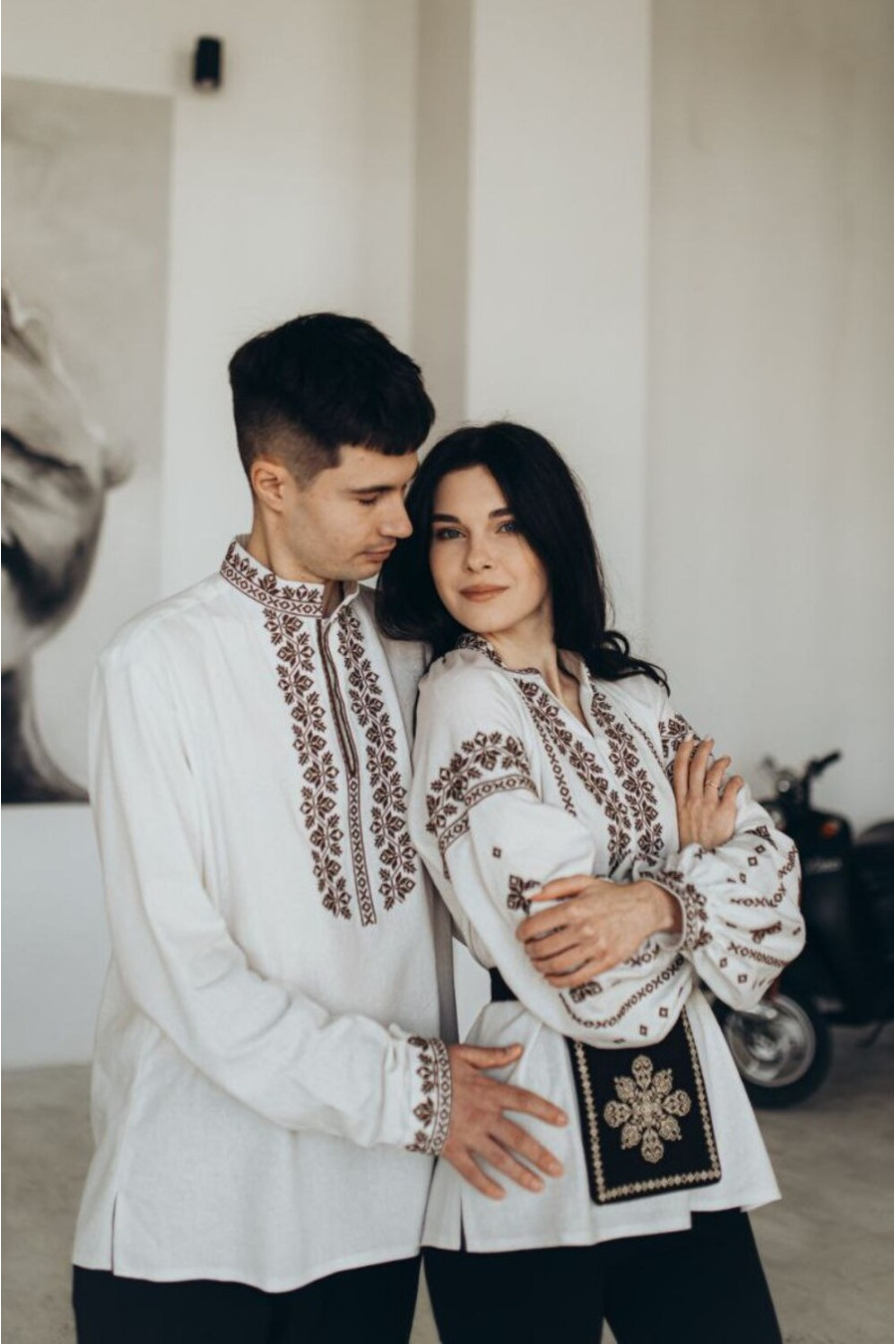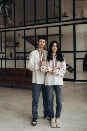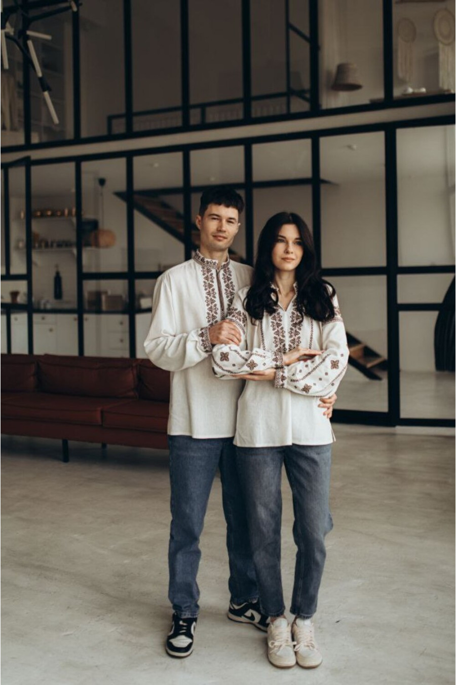 Ошатний комплект парних вишиванок у сучасному стилі «Витоки. Світло» із кремово-молочної лляної тканини з монохромним вишитим декором.