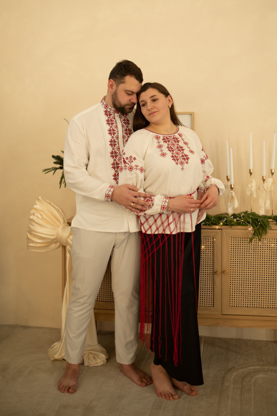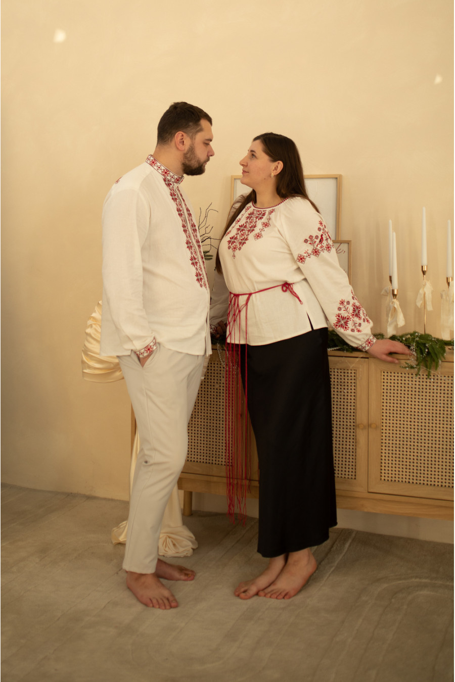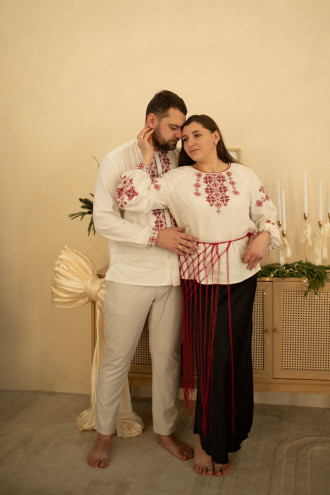 Комплект парних вишиванок «Зорі надії» з кремово-білого змішаного льону з контрастним вишитим орнаментом-декором.