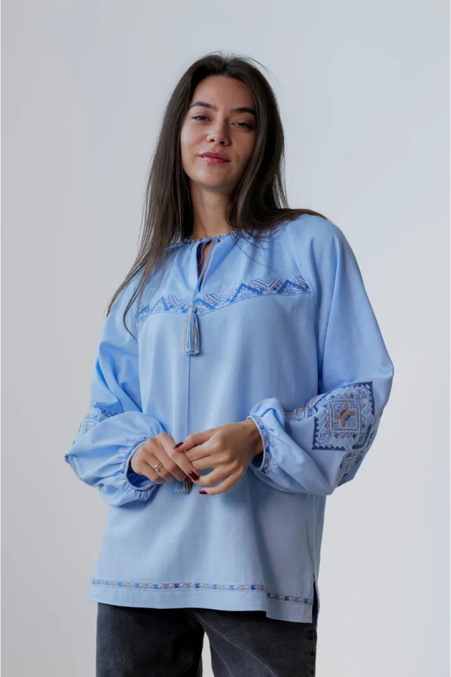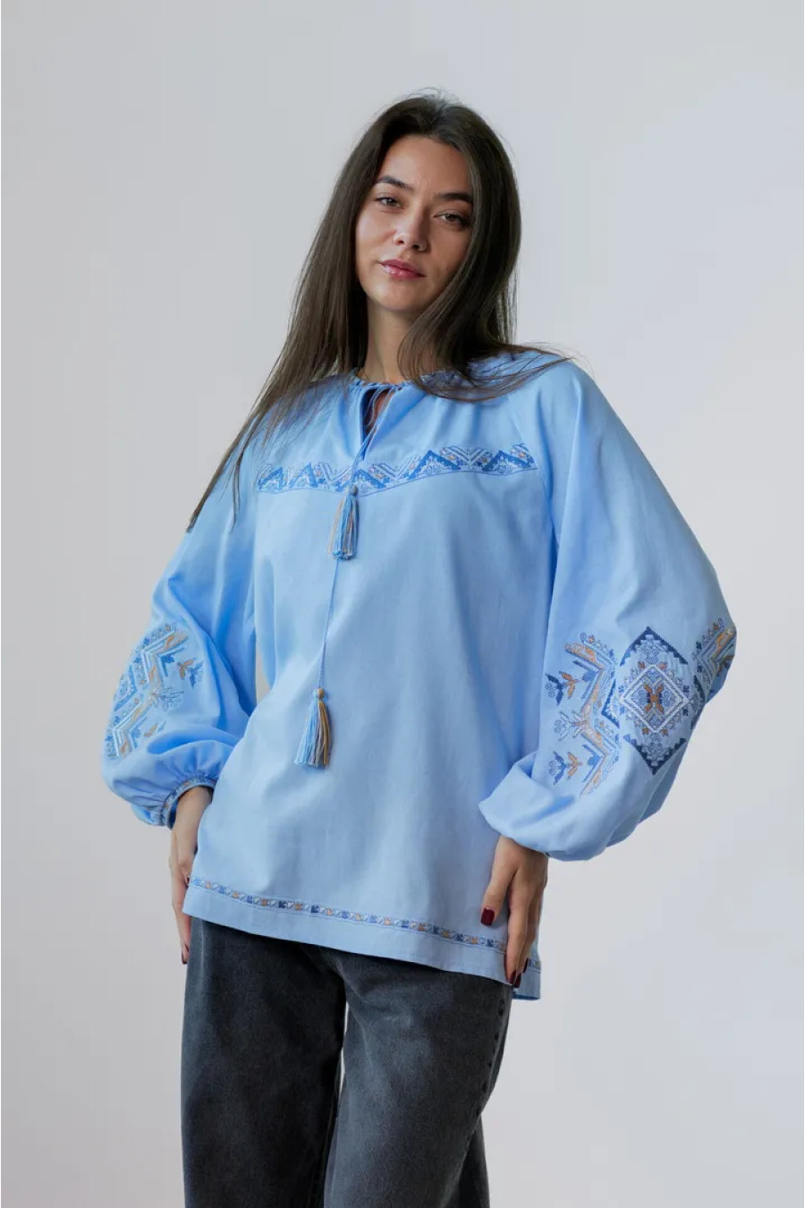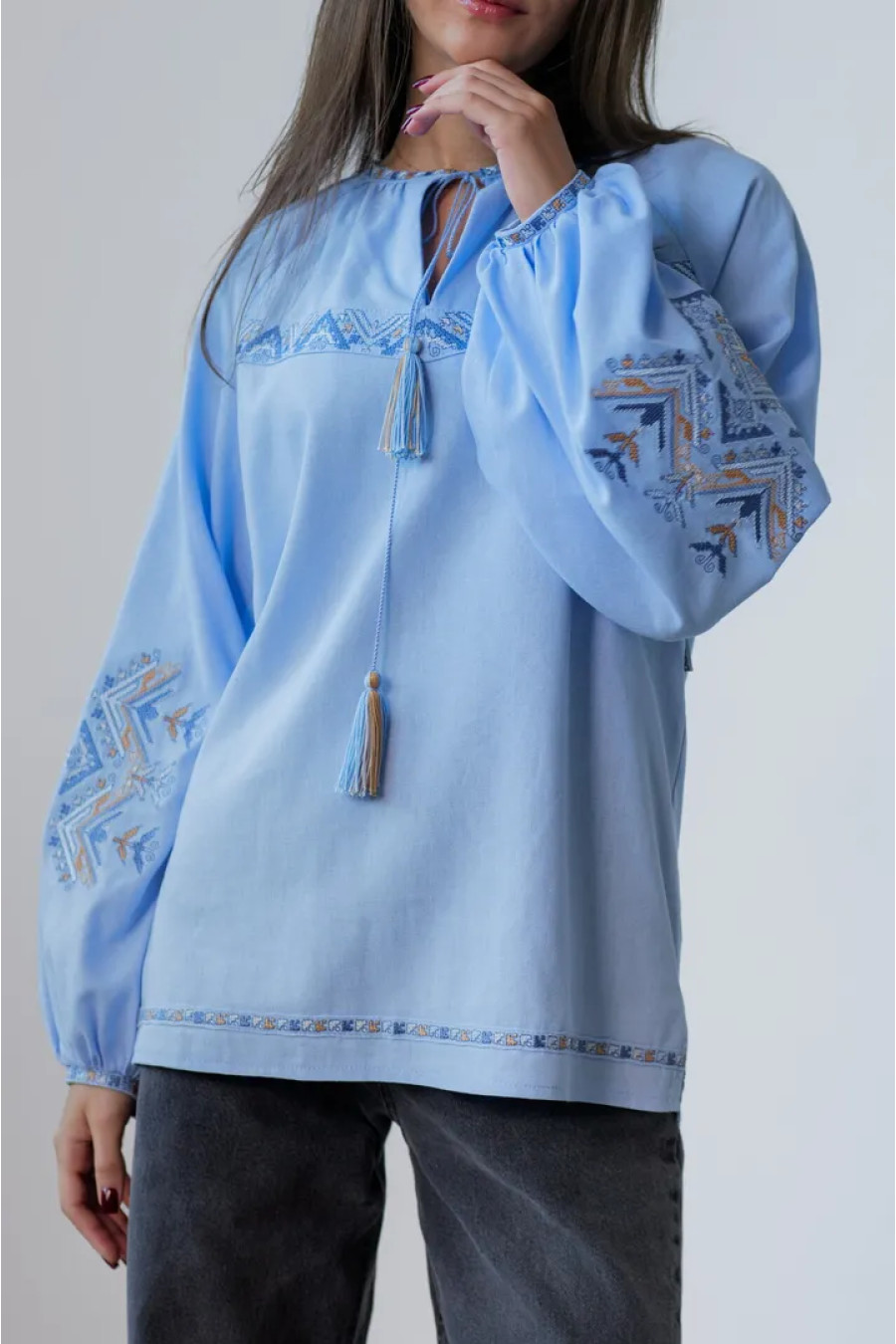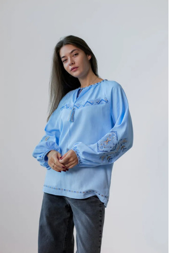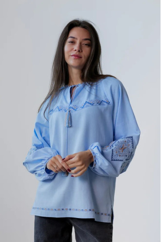 Традиційна жіноча вишиванка зі змішаної лляної тканини незабудково-блакитного кольору з барвистим вишитим декором, котра додасть образу свіжості та грайливості. Модель вільного силуету з округлою горловиною зі зборками, вирізом із зав'язками-кутасиками, довгими пишними рукавами-реглан із манжетами на застібці, шліцами в бічних швах. Рукави та поличку убрання декоровано багатоколірним геометричним орнаментом гладдю, горловину та поділ - в'яззю. Вишиванка підкреслить тендітність та стрункість форм, додасть образу ошатності та вишуканості. Убрання можна доповнити будь-якими варіантами низу з вашого гардеробу.