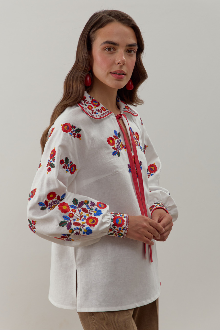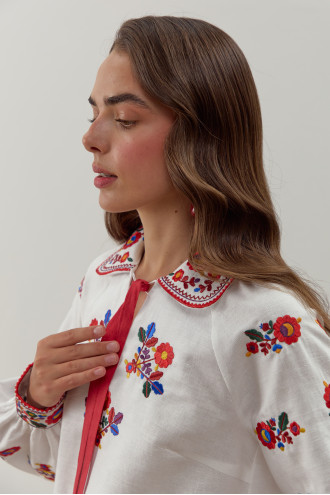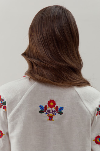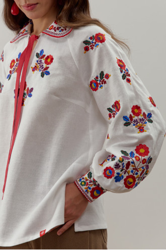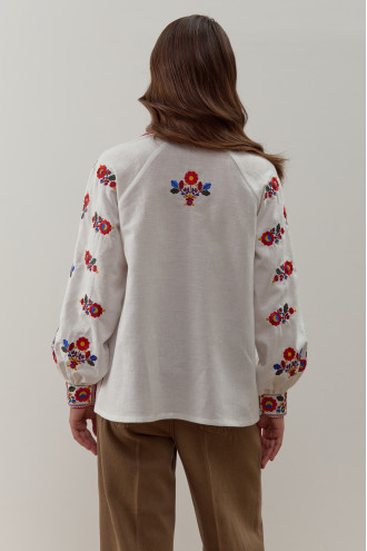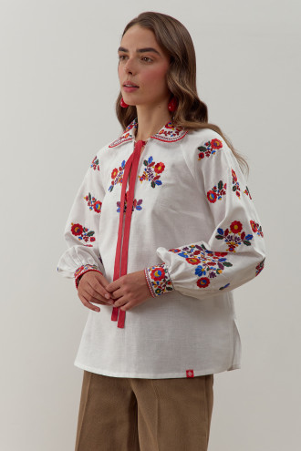Ошатна традиційна жіноча вишиванка з біло-кремового натурального льону з барвистим вишитим орнаментом та стрічкою-декором. Модель напівприлеглого фасону з відкладним комірцем, вирізом із зав'язкою-стрічкою, довгими пишними рукавами-реглан з високими манжетами на застібці, виточками на грудях, шліцами в бічних швах. Комірець, поличку, рукави та спинку декоровано вишитим гладдю яскравим квітковим орнаментом та геометричною в'яззю. Вишиванка додасть дівочому образу романтичності й чарівності, підкреслить стрункість й тендітність форм. Убрання прикрасить святковий гардероб та вдало поєднується як з офісним низом, так і з джинсами чи спідницями в стилі фолк.