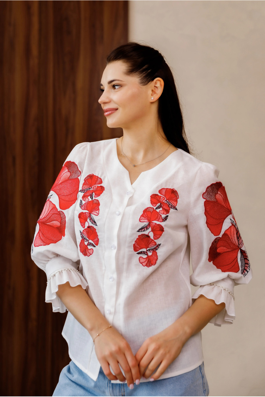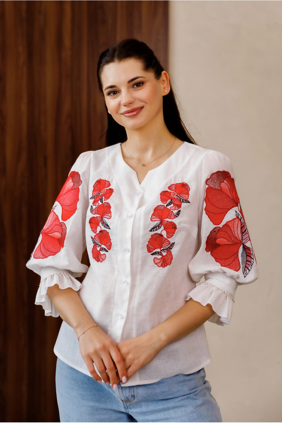 Елегантна сучасна жіноча вишиванка з приємної на дотик змішаної лляної тканини з яскравим вишитим орнаментом та декором-тасьмою з намистинами. Модель напівприлеглого силуету з фігурним вирізом горловини, пишними втачними рукавами 3/4 з манжетами-воланами на застібці, виточками на грудях та рельєфами швів, планкою з застібками-ґудзиками. Поличку та рукави прикрашає квітковий орнамент гладдю в червоно-чорній гамі. Вишиванка додасть образу грайливості та стильності, підкреслить жіночність та плавність фігури. Убрання прикрасить дівочий гардероб та буде доречним і для офісу, і для свята.