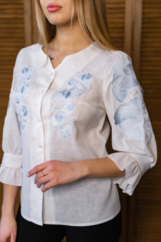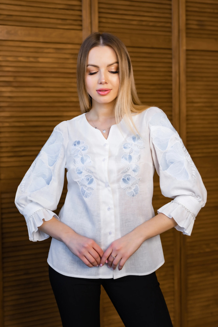 Білосніжна сучасна жіноча вишиванка зі змішаної лляної тканини з пастельним вишитим орнаментом та декором-тасьмою з намистинами. Модель напівприлеглого силуету з фігурним вирізом горловини, пишними втачними рукавами 3/4 з манжетами-воланами на застібці, виточками на грудях та рельєфами швів, планкою з застібками-ґудзиками. Поличку та рукави прикрашає квітковий орнамент гладдю у світло-блакитній та кремово-білій гамі. Вишиванка додасть образу грайливості та стильності, підкреслить жіночність та плавність фігури. Убрання прикрасить дівочий гардероб та буде доречним і для офісу, і для свята.