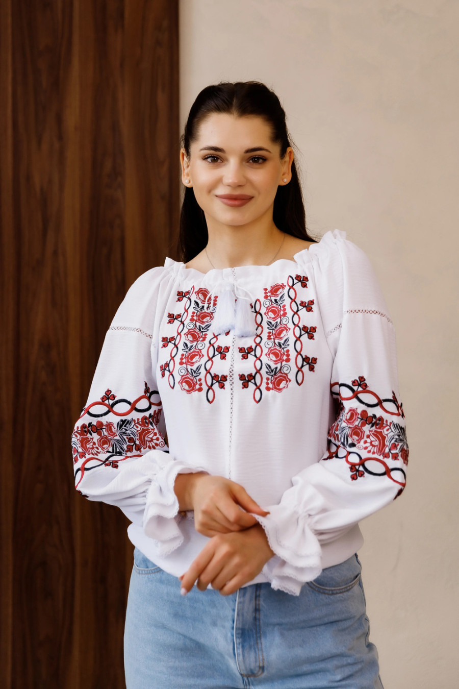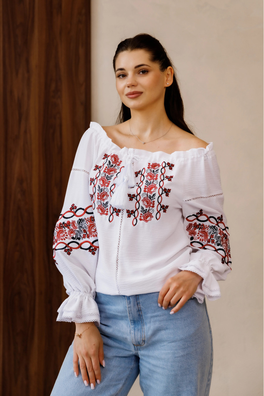 Елегантна жіноча вишиванка зі струменистої муслінової тканини білого кольору з контрастним вишитим декором та мережкою-тасьмою в тон тканини. Модель напівприлеглого фасону з широким воротом з куліскою та зав'язками-кутасиками, що дозволяє на бажання оголити плечі, довгими просторими рукавами-реглан із манжетами-воланами на резинці. Поличку та рукави декоровано квітковим орнаментом та рослинною в'яззю гладдю в чорно-вишневій гамі та мереживними вставками-тасьмою. Вишиванка додасть образу ніжності та повітряності, підкреслить плавність та тендітність форм. Убрання буде доречним в святковому гардеробі будь-якої дівчини та поєднується з різноманітними варїантами низу.