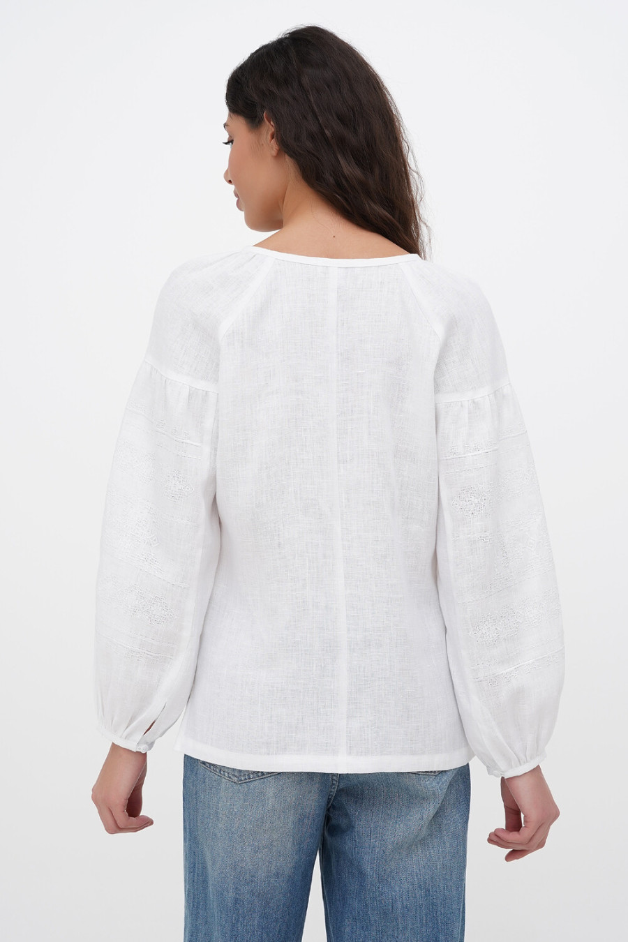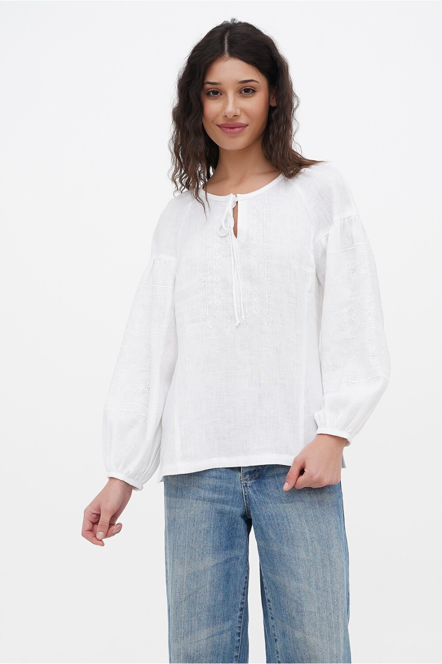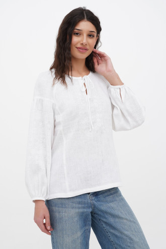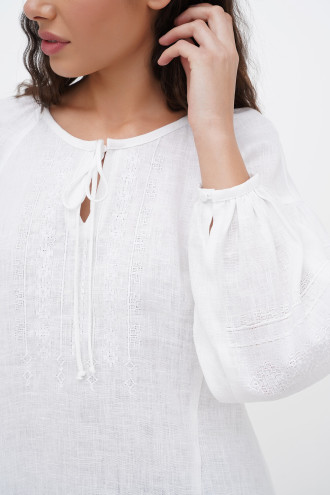 Білосніжна жіноча вишиванка з натурального льону з вишитим орнаментом-декором у тон тканини, котра додасть образу свіжості та романтичності. Модель вільного фасону з округлою горловиною зі зборками, неглибоким вирізом із зав'язками на поличці, довгими пишними рукавами-реглан із притачними манжетами на застібці, рельєфами швів та виточками на грудях, шліцами в бічних швах. Поличку та рукави оздоблено геометричним орнаментом. Вишиванка додасть образу ніжності та чарівності, підкреслить жіночність та тендітність силуету. Убрання буде гарним доповненням святкового гардеробу будь-якої панянки.