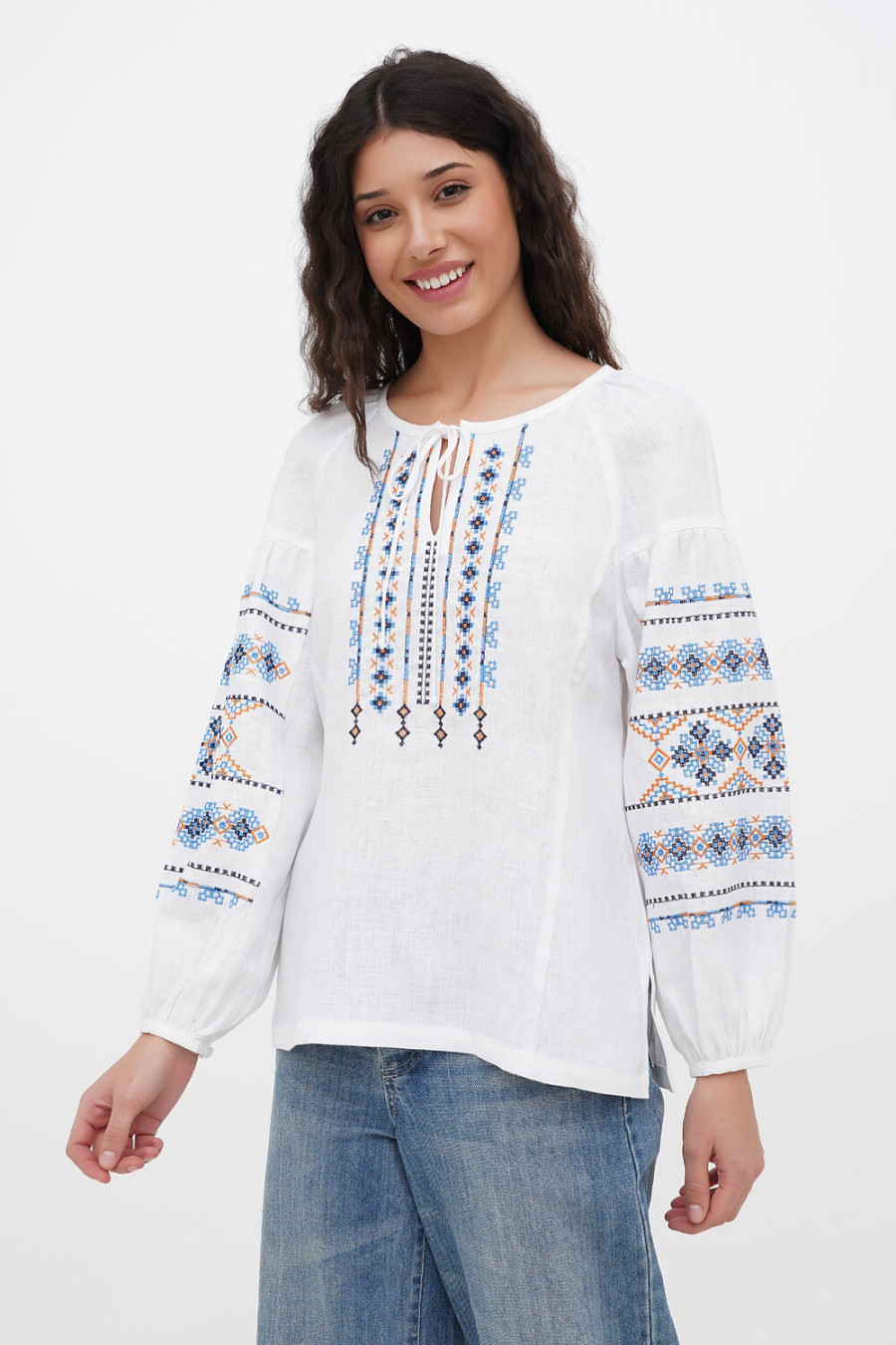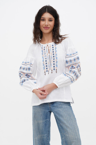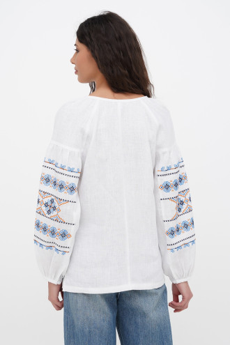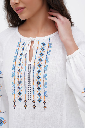 Ошатна жіноча вишиванка з натурального льону білого кольору з вишитим орнаментом-декором. Модель вільного фасону з округлою горловиною зі зборками, неглибоким вирізом із зав'язками на поличці, довгими пишними рукавами-реглан із притачними манжетами на застібці, рельєфами швів та виточками на грудях, шліцами в бічних швах. Поличку та рукави оздоблено геометричним орнаментом в блакитно-помаранчевій гамі з чорним обрамленням. Вишиванка додасть образу ніжності та чарівності, підкреслить жіночність та тендітність силуету. Убрання буде гарним доповненням святкового гардеробу будь-якої панянки.