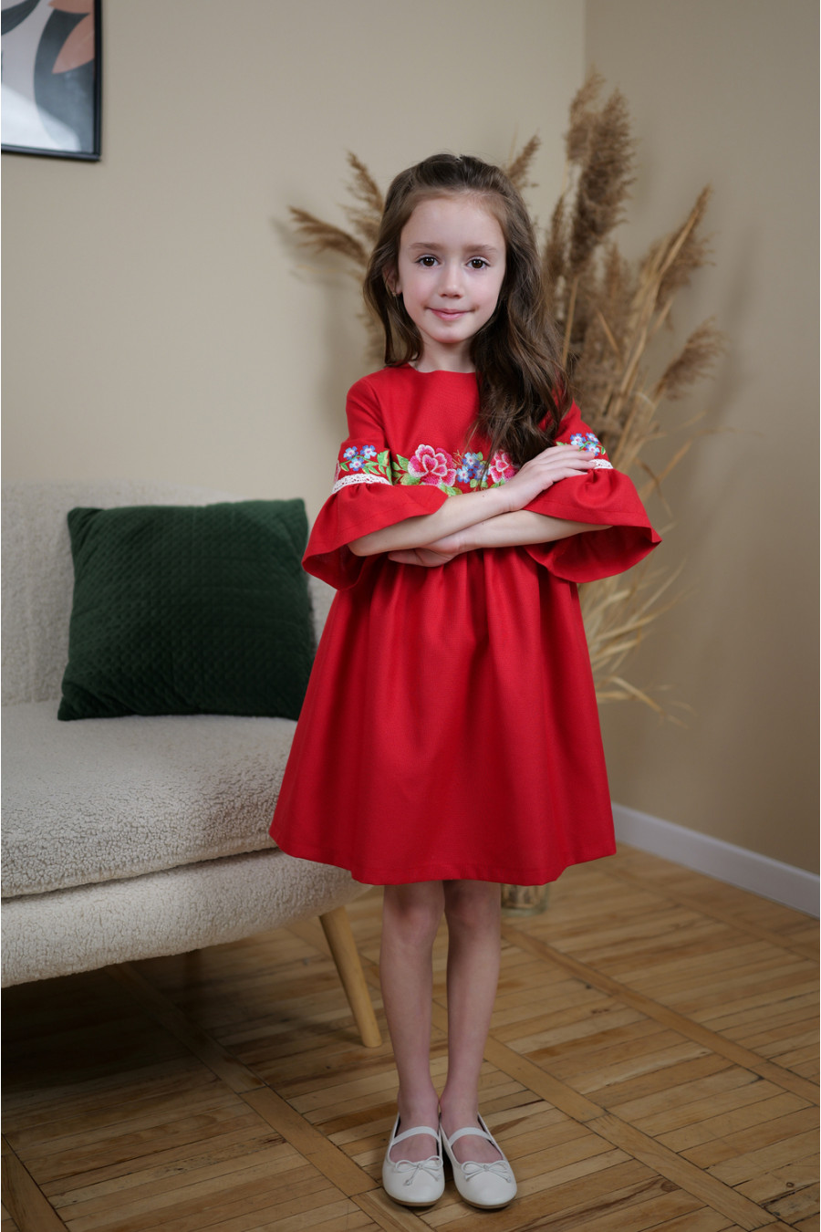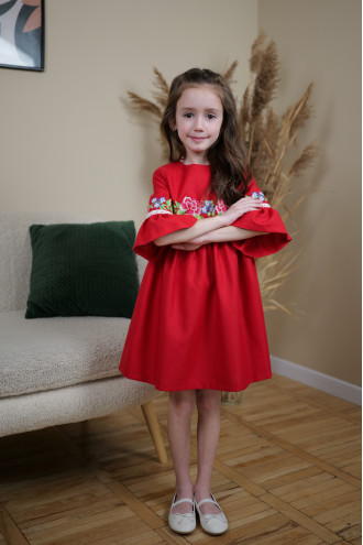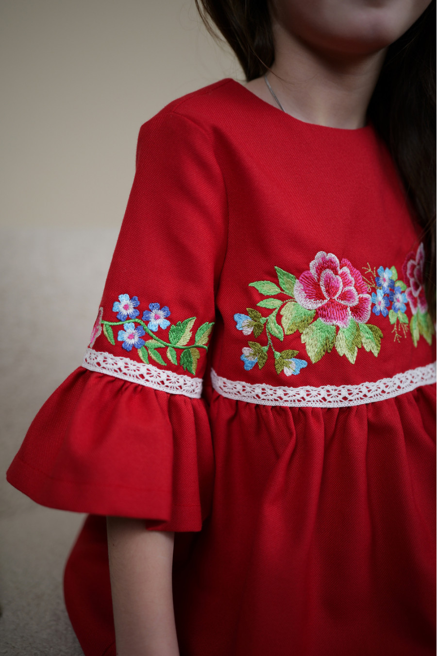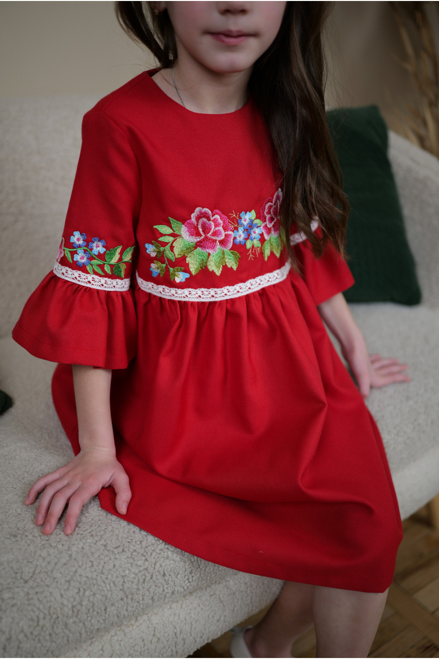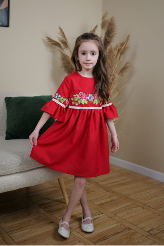 Яскраво-червона коротка вишита сукня для дівчинки з приємної до тіла змішаної лляної тканини з вишитим декором та кремово-білим мережевом, котра додасть образу соковитих барв. Модель вільного фасону з округлою горловиною, вирізом із застібкою на спинці, втачними рукавами 3/4 з манжетами-воланами, завищеною лінією талії, відрізною пишною спідницею. На поличці та рукавах розміщено барвистий квітковий орнамент гладдю, талію та манжети декоровано мереживними нашивками. Сукня додасть образу грайливості та легкості, підкреслить чарівність та ніжність юної леді. Убрання буде вдалим варіантом для будь-якого заходу.