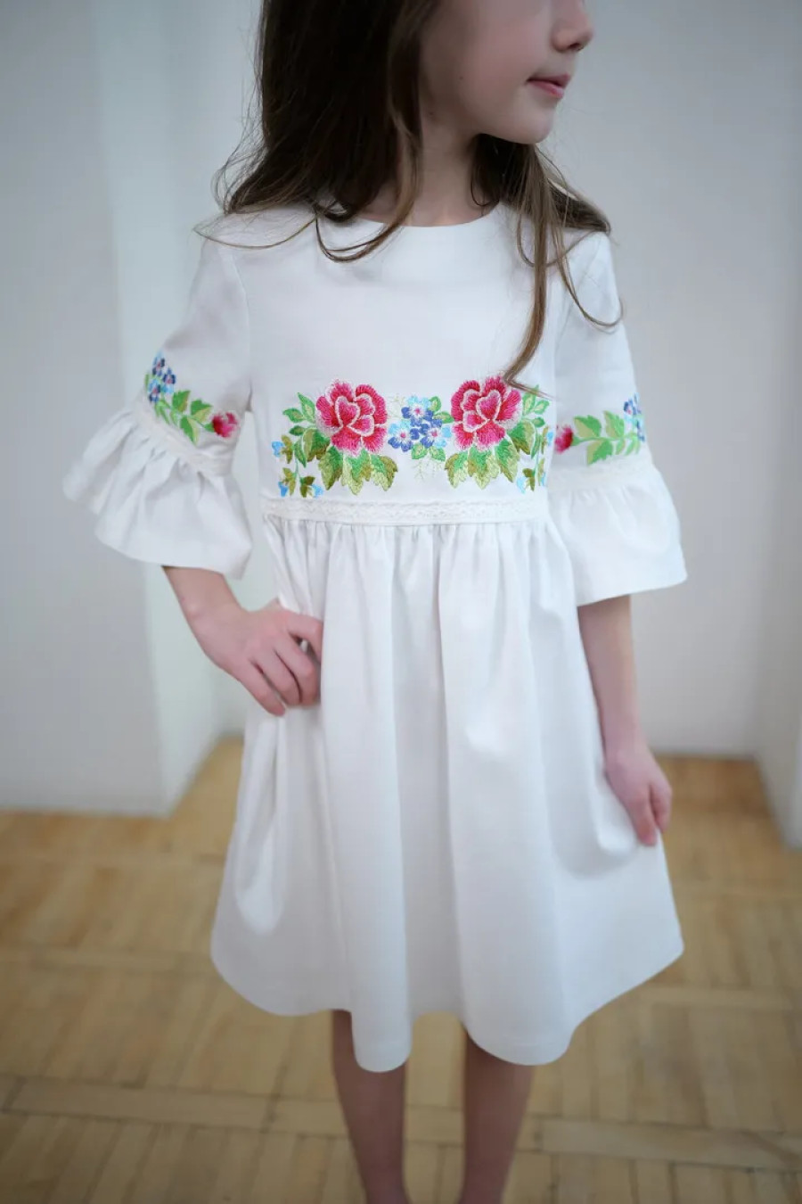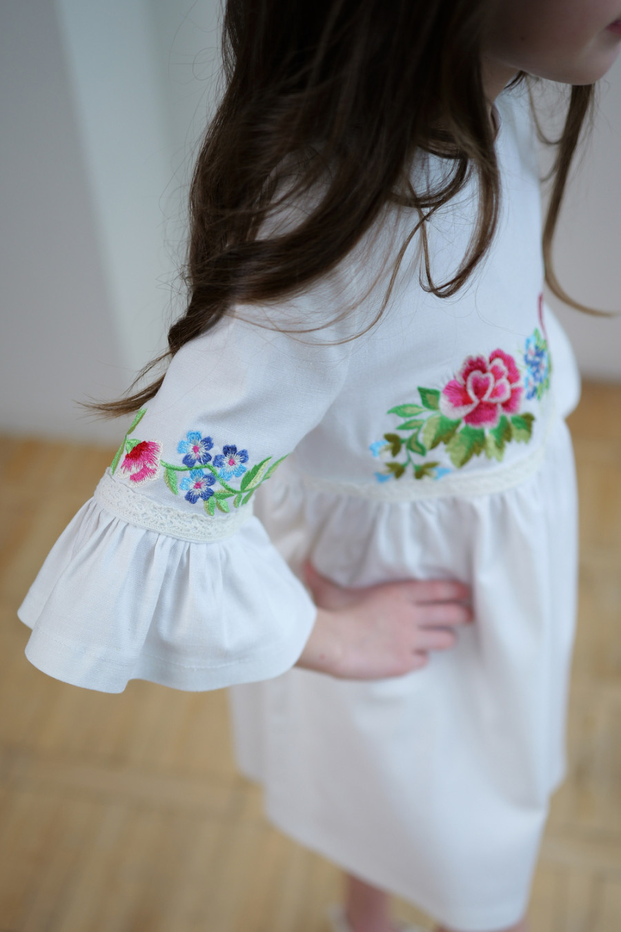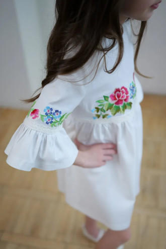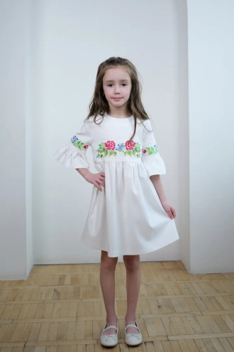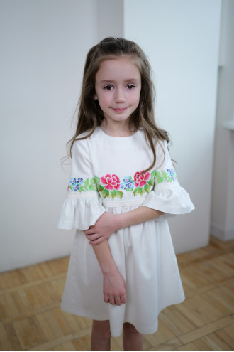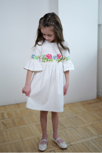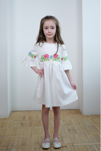 Чарівна коротка вишита сукня для дівчинки з приємної до тіла змішаної лляної тканини білого кольору з вишитим декором та мережевом у тон тканини. Модель вільного фасону з округлою горловиною, вирізом із застібкою на спинці, втачними рукавами 3/4 з манжетами-воланами, завищеною лінією талії, відрізною пишною спідницею. На поличці та рукавах розміщено барвистий квітковий орнамент гладдю, талію та манжети декоровано мереживними нашивками. Сукня додасть образу грайливості та легкості, підкреслить чарівність та ніжність юної леді. Убрання буде вдалим варіантом для будь-якого заходу.