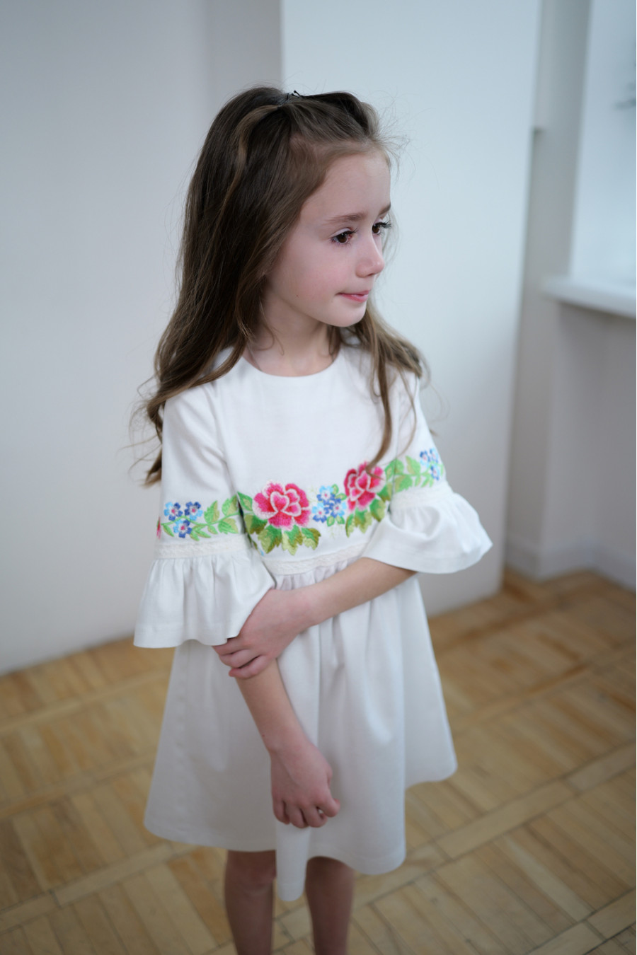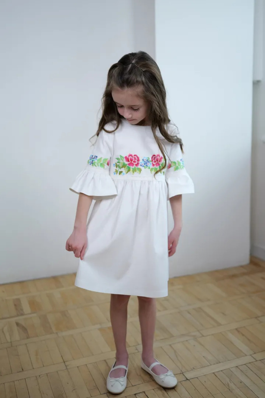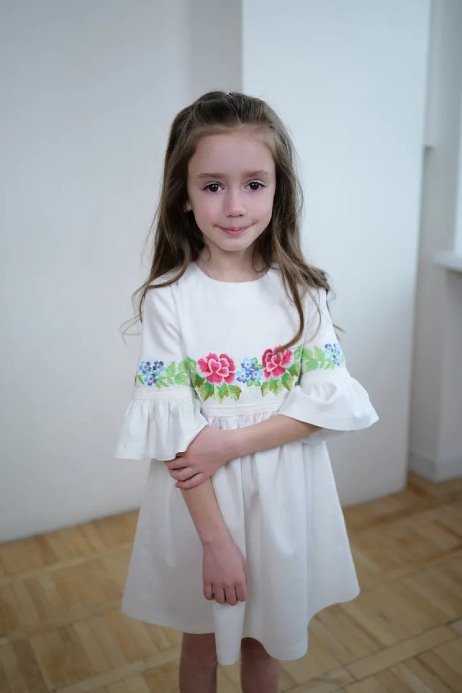 Чарівна коротка вишита сукня для дівчинки з приємної до тіла змішаної лляної тканини білого кольору з вишитим декором та мережевом у тон тканини. Модель вільного фасону з округлою горловиною, вирізом із застібкою на спинці, втачними рукавами 3/4 з манжетами-воланами, завищеною лінією талії, відрізною пишною спідницею. На поличці та рукавах розміщено барвистий квітковий орнамент гладдю, талію та манжети декоровано мереживними нашивками. Сукня додасть образу грайливості та легкості, підкреслить чарівність та ніжність юної леді. Убрання буде вдалим варіантом для будь-якого заходу.