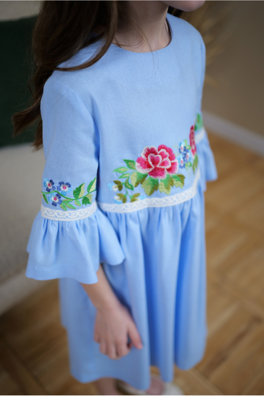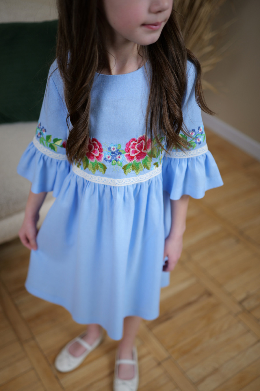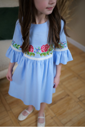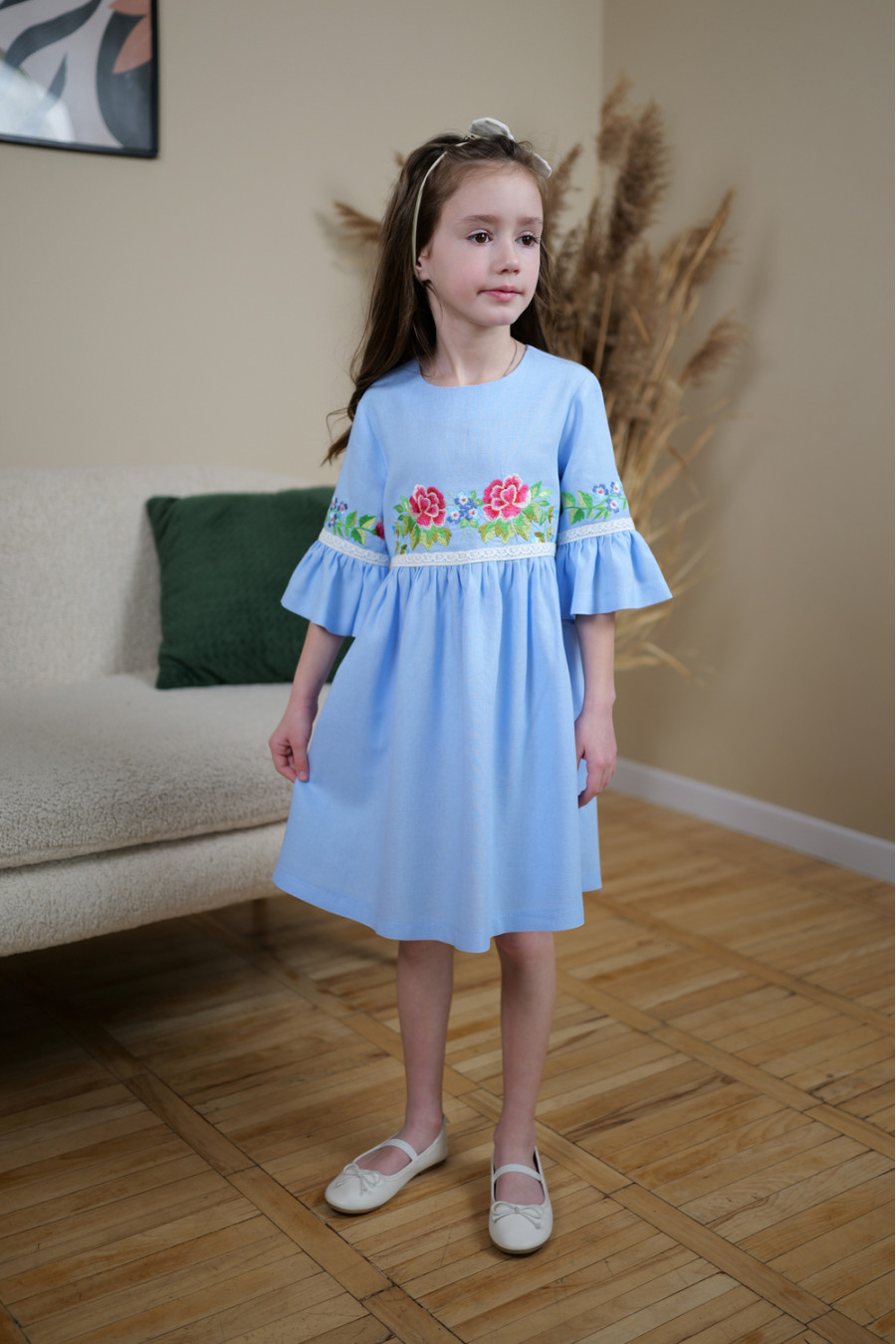 Небесно-блакитна коротка вишита сукня для дівчинки з приємної до тіла змішаної лляної тканини з яскравим вишитим декором та білим мережевом, котра доповнить святковий гардероб. Модель вільного фасону з округлою горловиною, вирізом із застібкою на спинці, втачними рукавами 3/4 з манжетами-воланами, завищеною лінією талії, відрізною пишною спідницею. На поличці та рукавах розміщено барвистий квітковий орнамент гладдю, талію та манжети декоровано мереживними нашивками. Сукня додасть образу грайливості та легкості, підкреслить чарівність та ніжність юної леді. Убрання буде вдалим варіантом для будь-якого заходу.