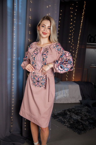 Вишита сукня-сорочка вище колін з приємної до тіла змішаної лляної тканини кольору курної троянди з пастельним вишитим декором. Модель вільного силуету з округлою горловиною зі зборками, неглибоким вирізом декольте з потаємною застібкою, довгими рукавами-реглан із широкими манжетами, швами-зборками на подолі, паском із основної тканини. Поличку та рукави декоровано рослинним орнаментом гладдю в рожево-синьо-чорній гамі. Сукня підкреслить плавність та красу форм, додасть образу свіжості та вишуканості. Убрання прикрасить гардероб будь-якої модниці та поєднується з різноманітними прикрасами й аксесуарами.