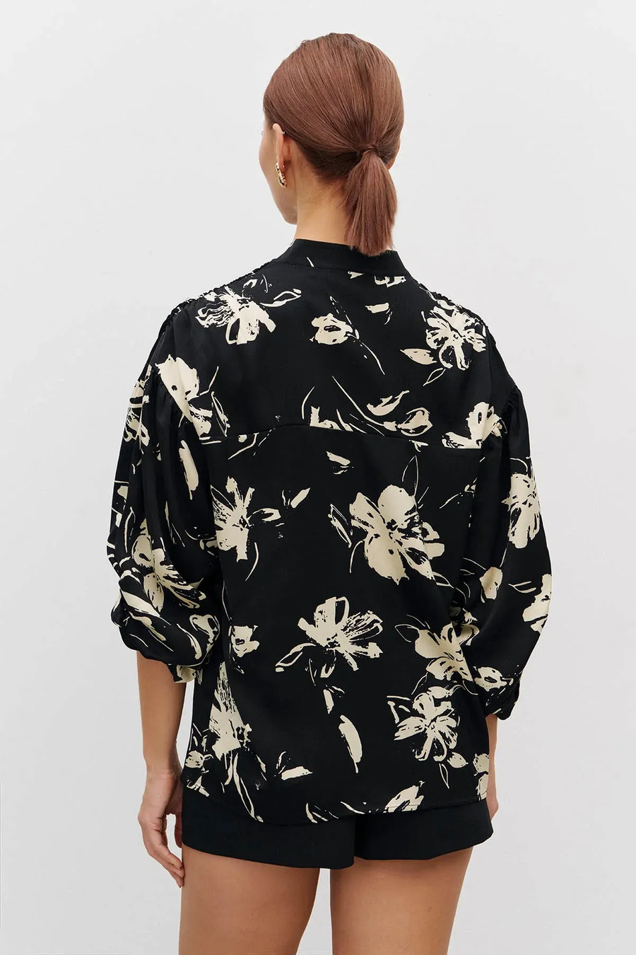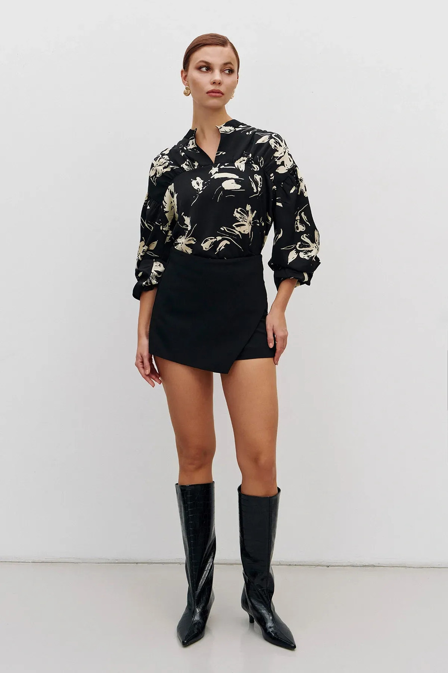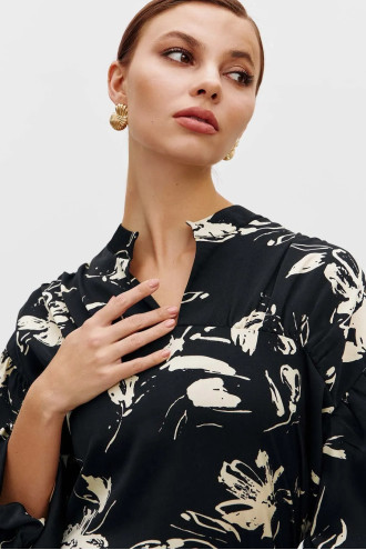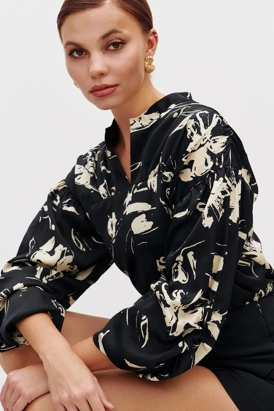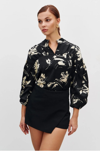 Ця шовковиста сорочка поєднує елегантність і сучасну грайливість. Модель прямого силуету з V-подібним коміром-стійкою, який додає легкого акценту і витонченості. Об'ємні рукави мають вертикальний шов, збираються у манжету на резинці. Вони створюють повітряний, граційний силует. Тканина гладка та приємна на дотик, красиво струмує по фігурі і легко рухається разом з вами. Блузка відмінно виглядає на випуск та в заправленому стані.