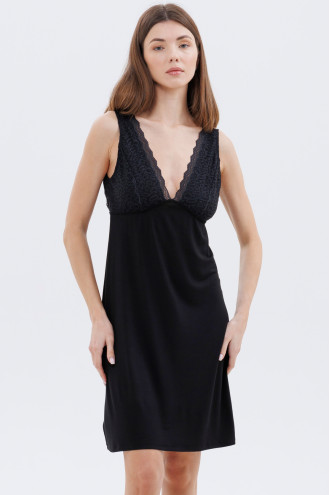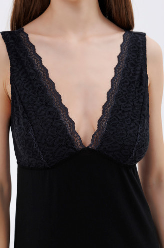 Стильна чорна нічна сорочка вище колін із віскозної трикотажної тканини з ажурним мереживом-вставками у тон, котра дасть можливість відпочити та набратись сил після важкого дня. Модель напівприлеглого фасону з глибоким V-подібним вирізом декольте та на спинці з ажурним драпіруванням-нашивкою, відрізним ліфом з мереживною спинкою, широкими шлеями. Сорочка додасть образу жіночності та вишуканості, підкреслить тендітність силуету.