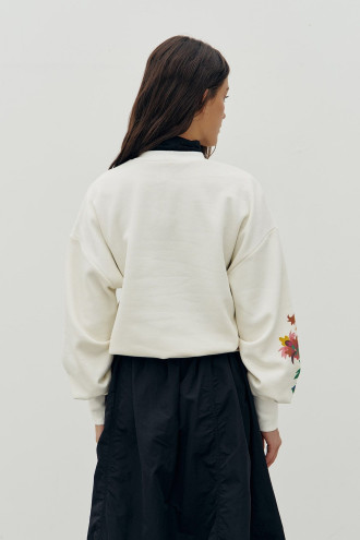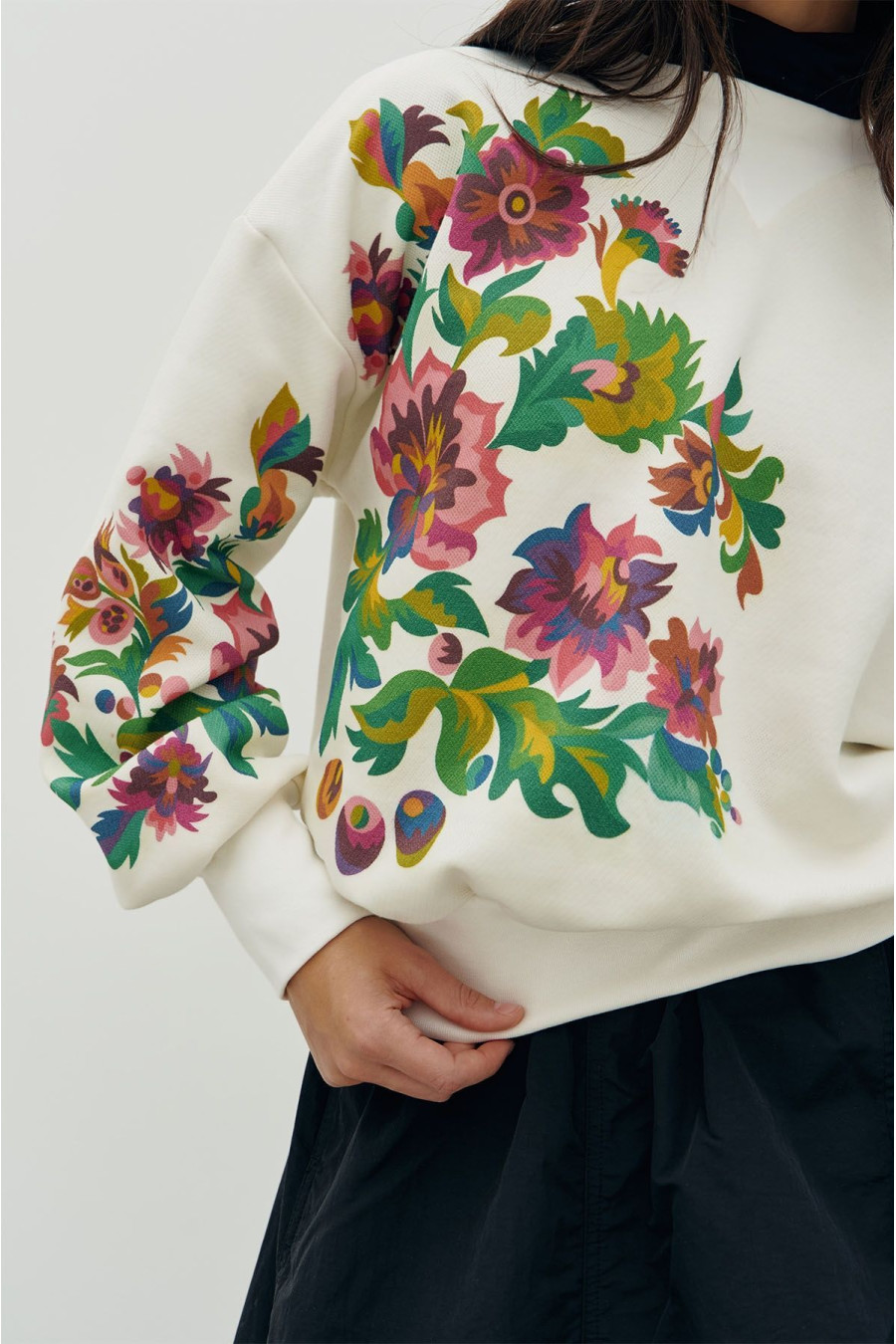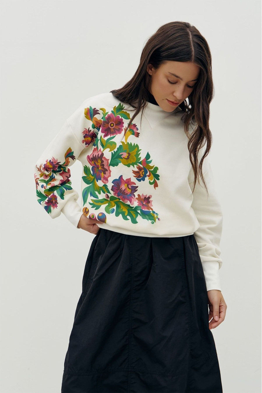 Вишуканий демісезонний світшот із приємного до тіла бавовняного трикотажу (тринитка петля) молочно-кремового кольору з барвистим рослинним принтом за мотивами самчиківського розпису. Модель вільного силуету з фігурним вирізом горловини, приспущеною лінією плеча, довгими просторими рукавами з високими манжетами-резинками та широкою манжетою на подолі. Світшот освіжить дівочий гардероб, підкреслить плавність та жіночність форм. Убрання вдало поєднується як з класичними офісними моделями, так і з джинсами-кежуал.