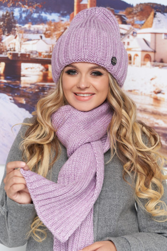 Чарівний пастельний лавандово-бузковий в'язаний комплект зі змішаної теплої пряжі з візерунком-резинкою, котрий освіжить теплий дівочий гардероб. Модель складається з шапки-ковпака з широким відворотом, підкладкою з мікрофлісу та довгого шарфа, що зігріє шию в холодну пору. Комплект доповнить демісезонний та зимовий гардероб й гарно поєднується з різноманітними стилями верхнього одягу.