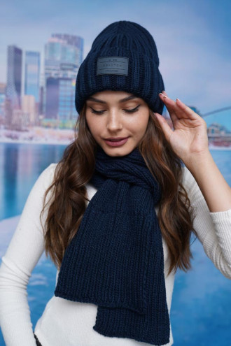 Елегантний в'язаний комплект зі змішаної пряжі кольору темно-синього джинсу з об'ємним візерунком - відмінний варіант і для міжсезоння, і для зими. Комплект складається з двошарової подовженої шапки з відворотом, брендованим декором та затишного довгого шарфа, котрий зігріє горло в негоду. Виріб підкреслить жіночність та вишуканість образу. Комплект підійде і до зимового пальто, і до пуховика чи спортивної куртки.