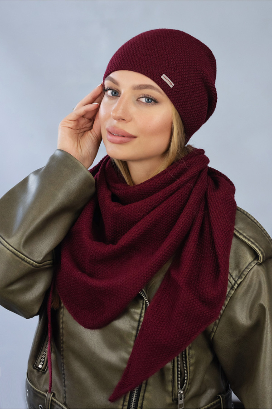 Вишуканий бордово-винний теплий жіночий комплект із приємної на дотик змішаної вовняної пряжі з об'ємним фактурним візерунком. Модель складається з двошарової шапки-біні по голові з невеликим брендованим декором-лейбом та косинки-шалі, котра зігріє і шию, і плечі. Комплект подарує відчуття тепла в холодну пору, підкреслить стильність та жіночність образу. Аксесуар вдало поєднується і з класичним пальто, і з курткою-дутиком чи пуховиком.