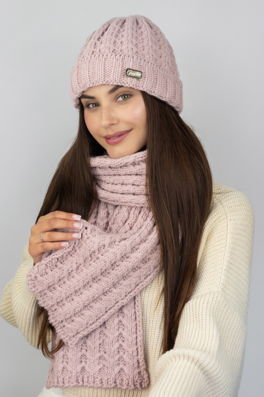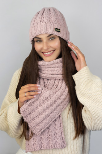 Стильний в'язаний комплект кольору пудри зі змішаної пряжі з виразним об'ємним візерунком, подарує комфорт та зігріє у найлютіші морози. Модель складається з шапки та шарфа крупної в'язки яка створює сучасний акцент. Комплект доповнить демісезонний та зимовий гардероб й гарно поєднується з різноманітними стилями верхнього одягу.