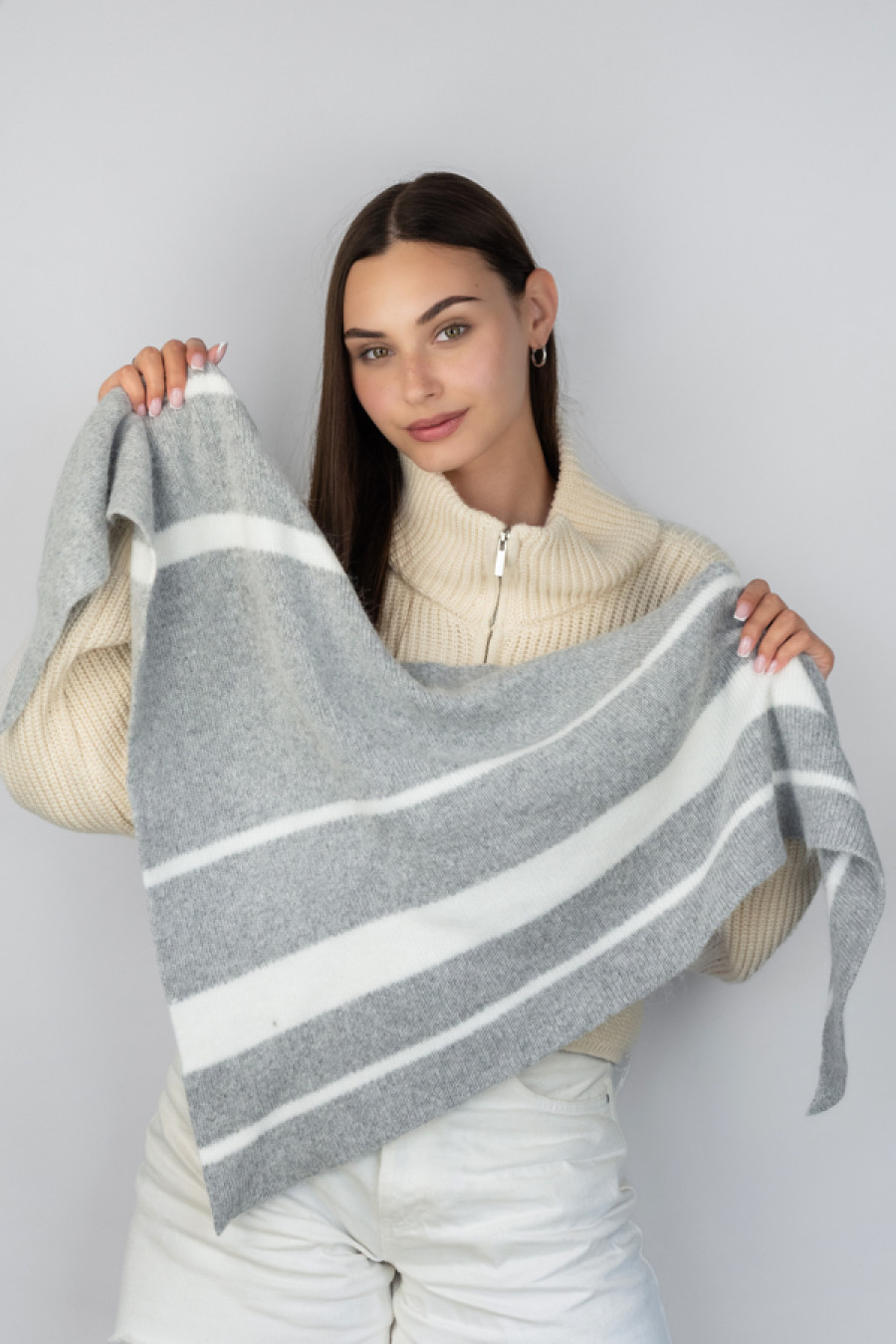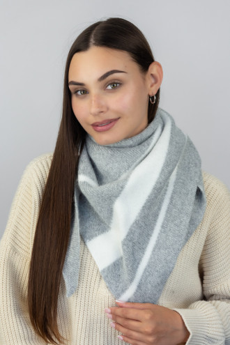 Стильна в'язана тепла косинка-бактус із м'якої пухнастої вовняної пряжі з хутром кролика світло-сірого кольору з біло-кремовим малюнком-смужками, котра подарує відчуття комфортного тепла в зимову пору. Аксесуар буде доречним в гардеробі будт-якої панянки та вдало поєднується як классичним пальто, так і з кежуал чи спортивними моделями.