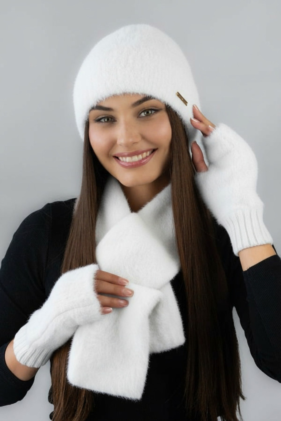 Чарівний теплий в'язаний комплект білого кольору з м'якої пухнастої пряжі з додаванням мохеру і котону, котрий додасть образу романтичності та ніжності. Модель складається із шапки, шарфа та мітенок котрі зігріють ваші руки навіть в сильні холоди. М'яка фактура пряжі дарує комфорт, а лаконічний дизайн підкреслить жіночність.