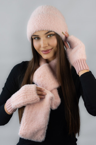 Чарівний теплий в'язаний комплект кольору пудри з м'якої пухнастої пряжі з додаванням мохеру і котону, котрий додасть образу романтичності та ніжності. Модель складається із шапки, шарфа та мітенок котрі зігріють ваші руки навіть в сильні холоди. М'яка фактура пряжі дарує комфорт, а лаконічний дизайн підкреслить жіночність.
