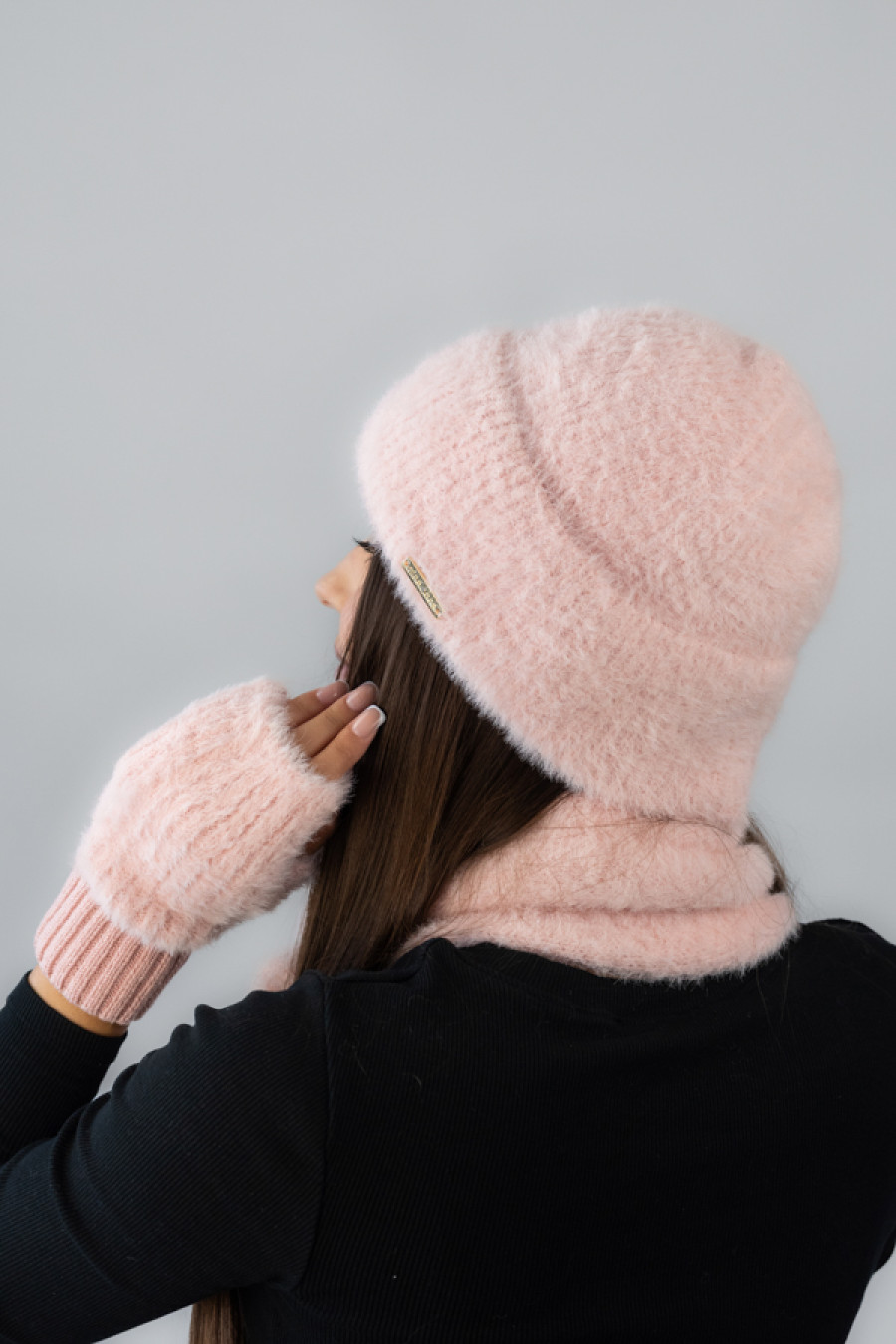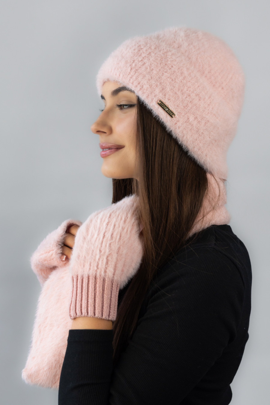 Чарівний теплий в'язаний комплект кольору пудри з м'якої пухнастої пряжі з додаванням мохеру і котону, котрий додасть образу романтичності та ніжності. Модель складається із шапки, шарфа та мітенок котрі зігріють ваші руки навіть в сильні холоди. М'яка фактура пряжі дарує комфорт, а лаконічний дизайн підкреслить жіночність.