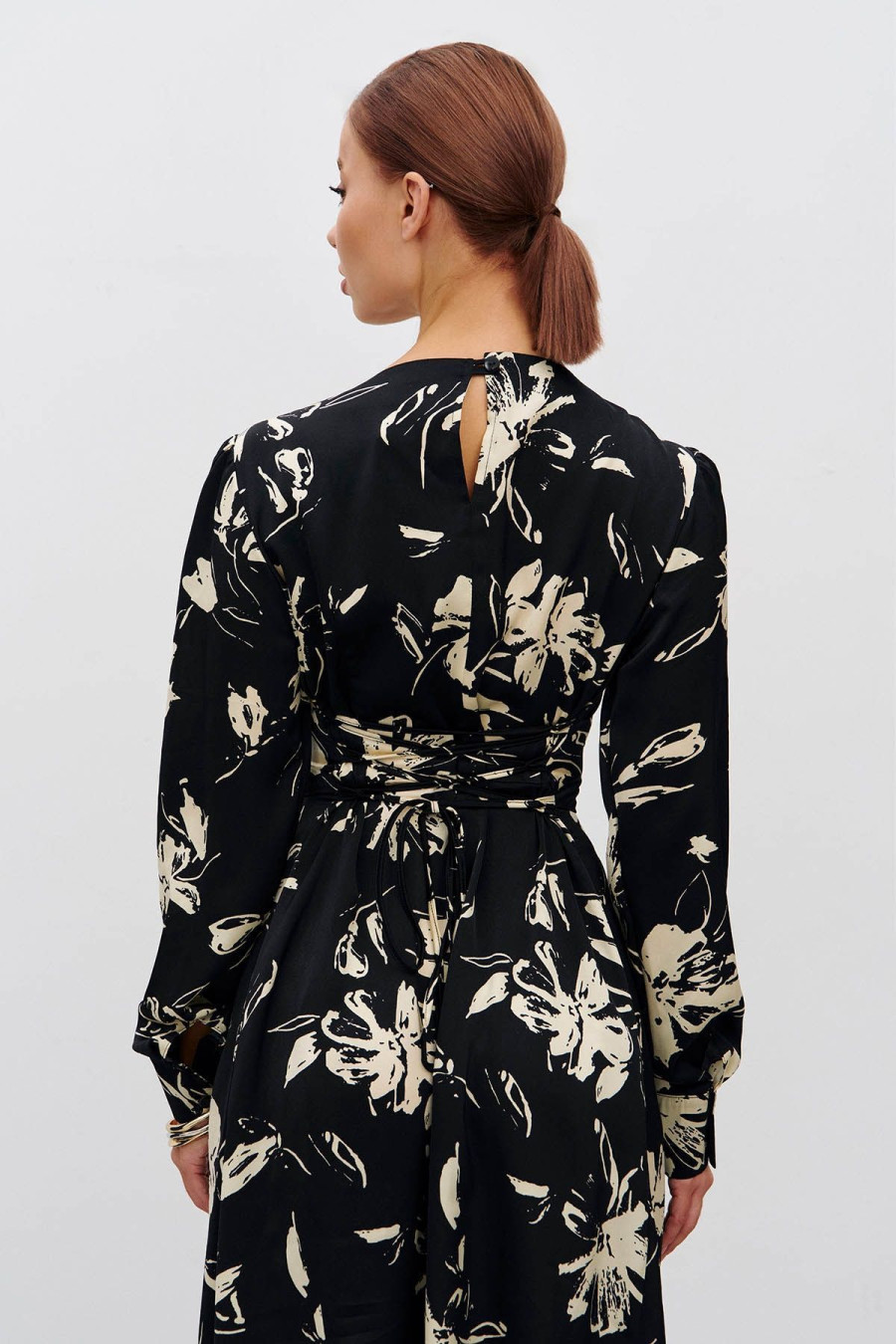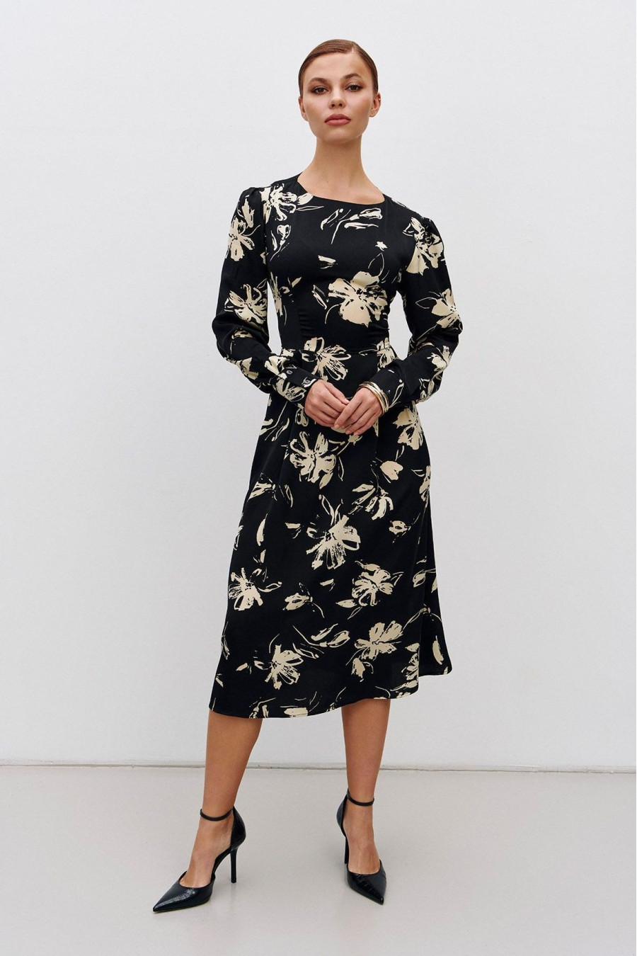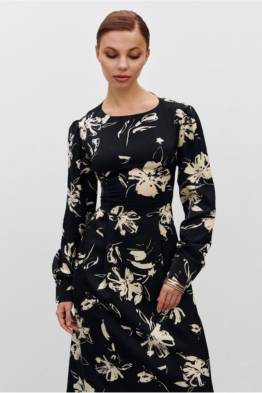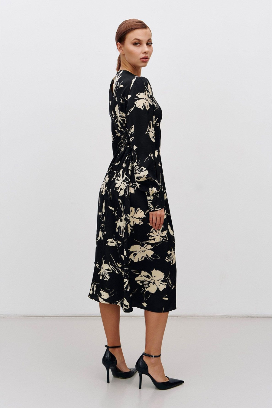 Елегантна демісезонна сукня-міді зі штучного шовку чорного кольору зі молочно-кремовим квітковим принтом, котра прикрасить дівочий гардероб. Модель напівприлеглого силуету з округлою горловиною, вирізом із застібкою-ґудзиком на спинці, довгими втачними рукавами з високими манжетами на застібці, корсетною шнурівкою на спинці, котра регулює прилягання, фігурними виточками, відрізною просторою спідницею. Сукня додасть образу вишуканності та загадковості, підкреслить стрункість та граційність фігури. Убрання буде доречним для будь-якого свята та гарно поєднується з різноманітними аксесуарами.