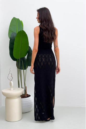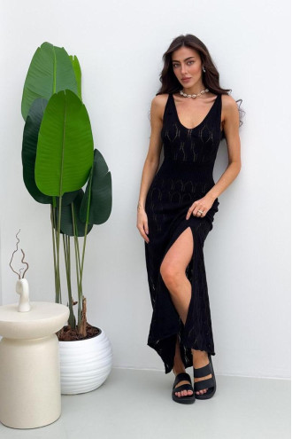 Стильна літня сукня створена для витончених та ніжних образів теплого сезону. Виконана з ажурного в'язаного полотна, що виглядає легко й повітряно. Модель має глибокий округлий виріз і приталений крій, який формується за рахунок вбудованої в'язаної резинки на рівні талії. З обох боків передбачені глибокі розрізи, краї яких акуратно оформлені еластичною в'язкою-резинкою. Сукня виглядає водночас ніжно й виразно, ідеально підходить для спектоних днів та легких літніх образів.