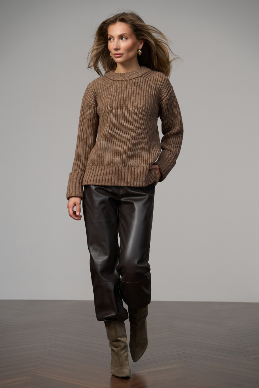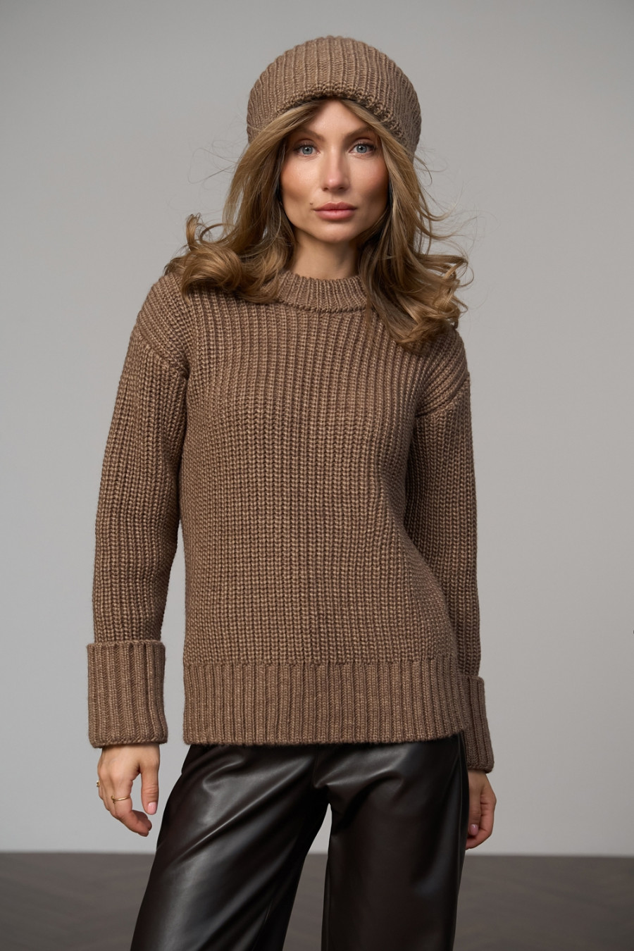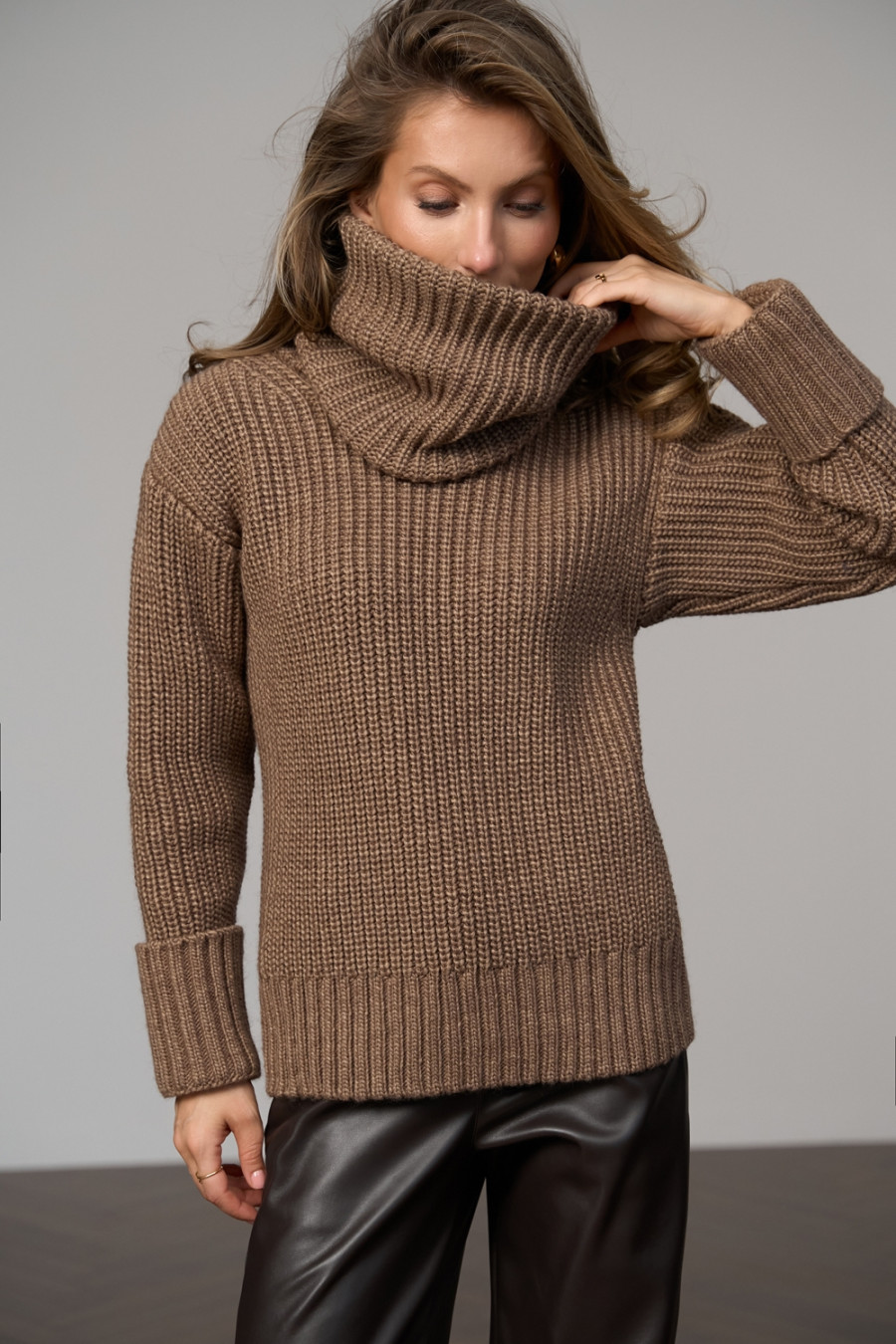 Светр із хомутом «Аляска» теплого коричневого кольору об'ємної в'язки. Для нього використана преміальна пряжа вовни мериноса та альпаки. Силует – прямий, вільного крою. Рукави зі спущеною лінією плеча та нетугими широкими манжетами з відворотом. Модель має з'ємний хомут подвійної в'язки, що додатково захистить від холоду та додасть образу родзинку.