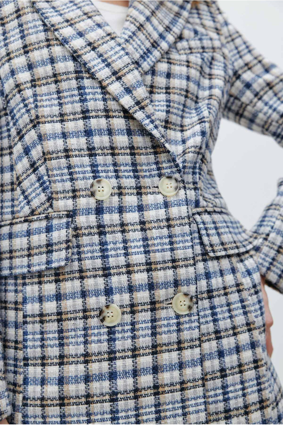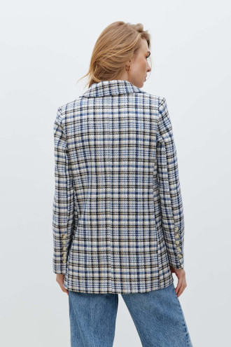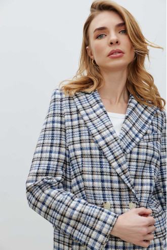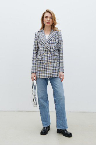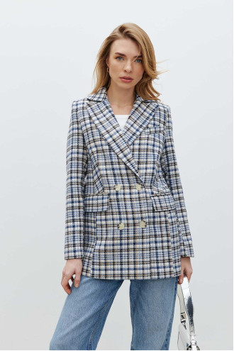 Картатий стильний демісезонний двобортний жакет із фактурного принтованого трикотажу в бежево-біло-чорно-блакитній гамі, котрий буде гарним доповненням "верхнього" гардеробу. Модель вільного крою з відкладним комірцем з лацканами, втачними довгими рукавами без манжет, кишенею на грудях та на рівні стегон, застібками-ґудзиками на поличці. Жакет додасть образу елегантності, підкреслить плавність та жіночність форм. Убрання подарує відчуття тепла в негоду та вдало доповнить будь-який гардероб.