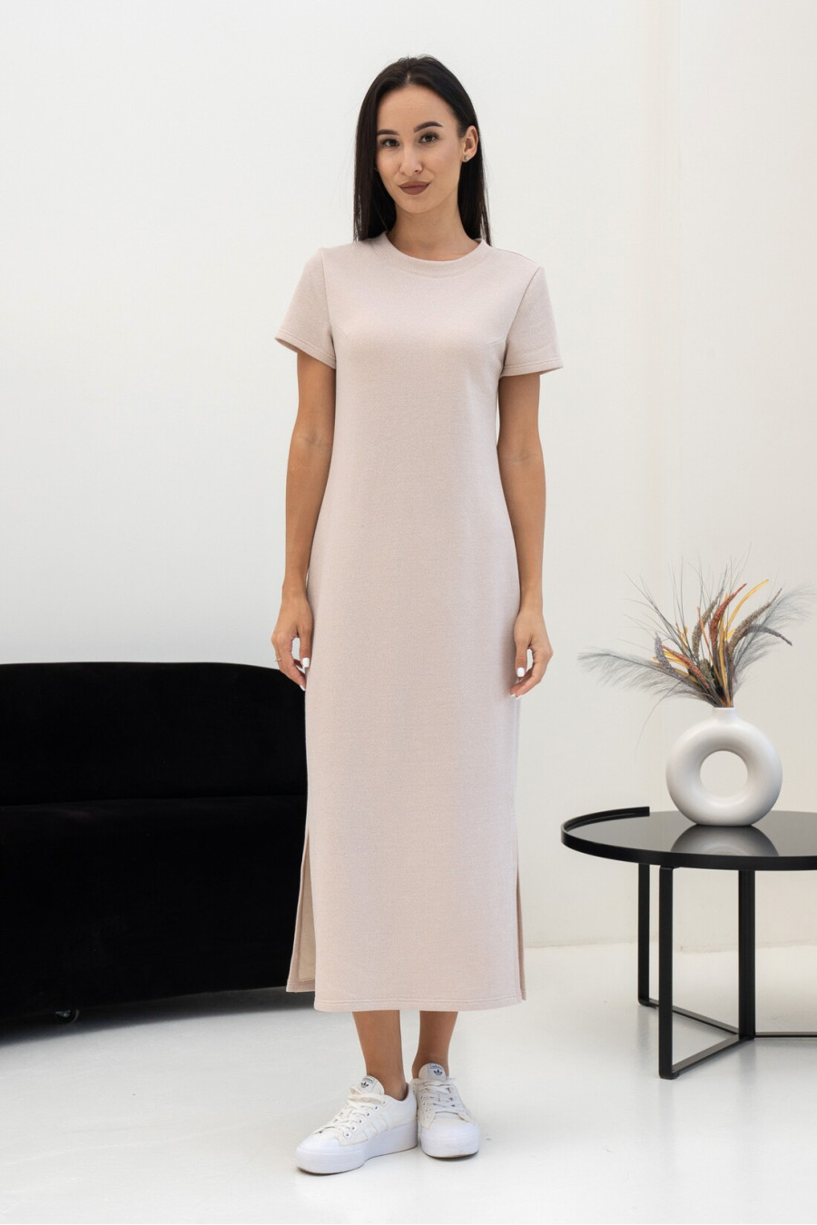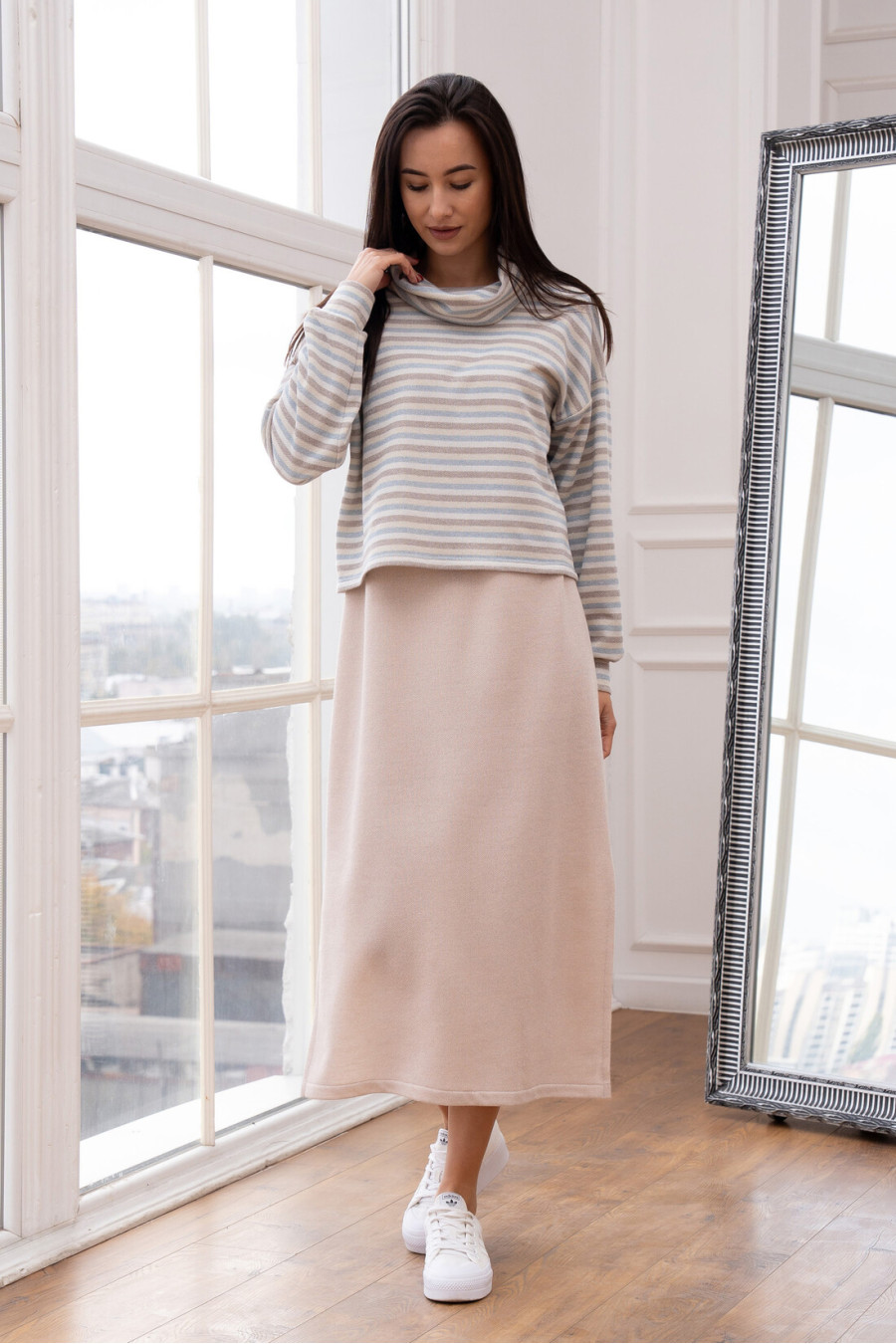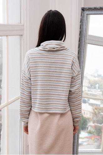 Костюм із трикотажу - це поєдання вишуканої фактури та бездоганного комфорту. Светр із м'яким коміром-стійкою, спущенною лінією плеча та довгим рукавом. Сукня довжиною міді, має легке розширення до низу та стильний розріз з одного боку. Ніжний трикотаж красиво тримає форму та виглядає стильно і благородно. Такий костюм подарує відчуття максимального комфорту в прохолодну пору року.